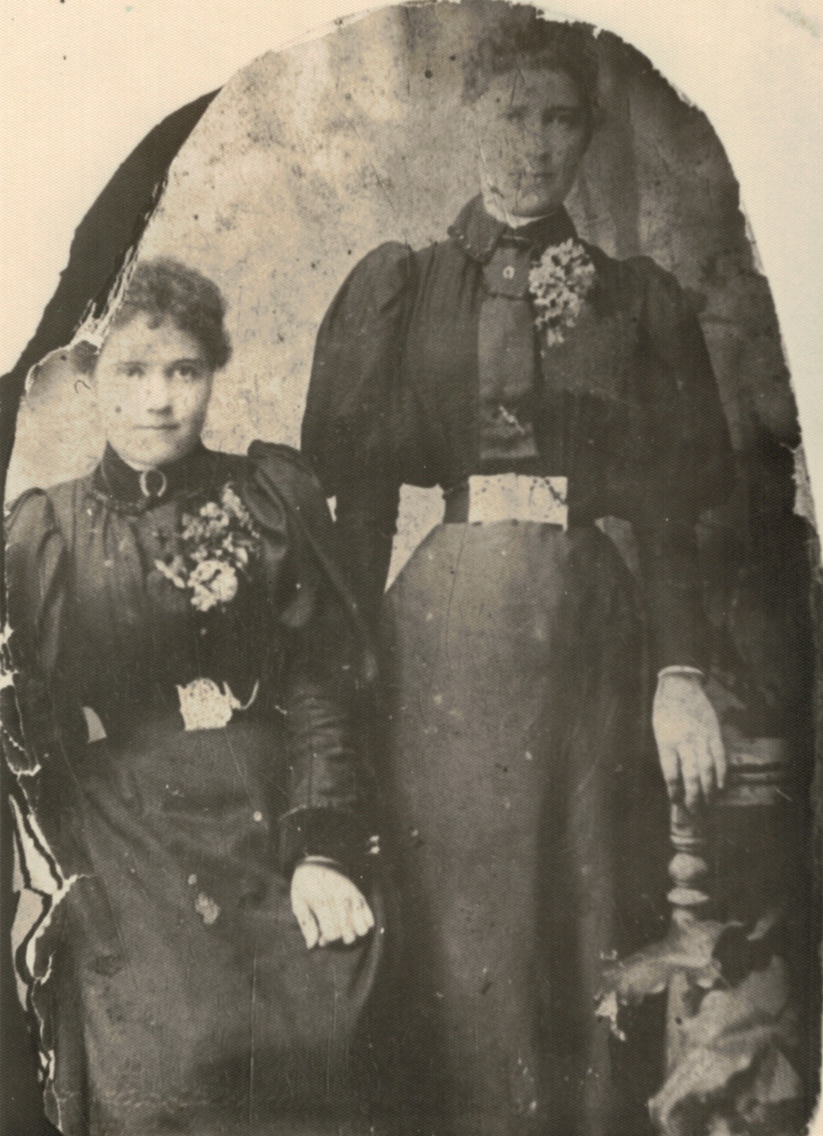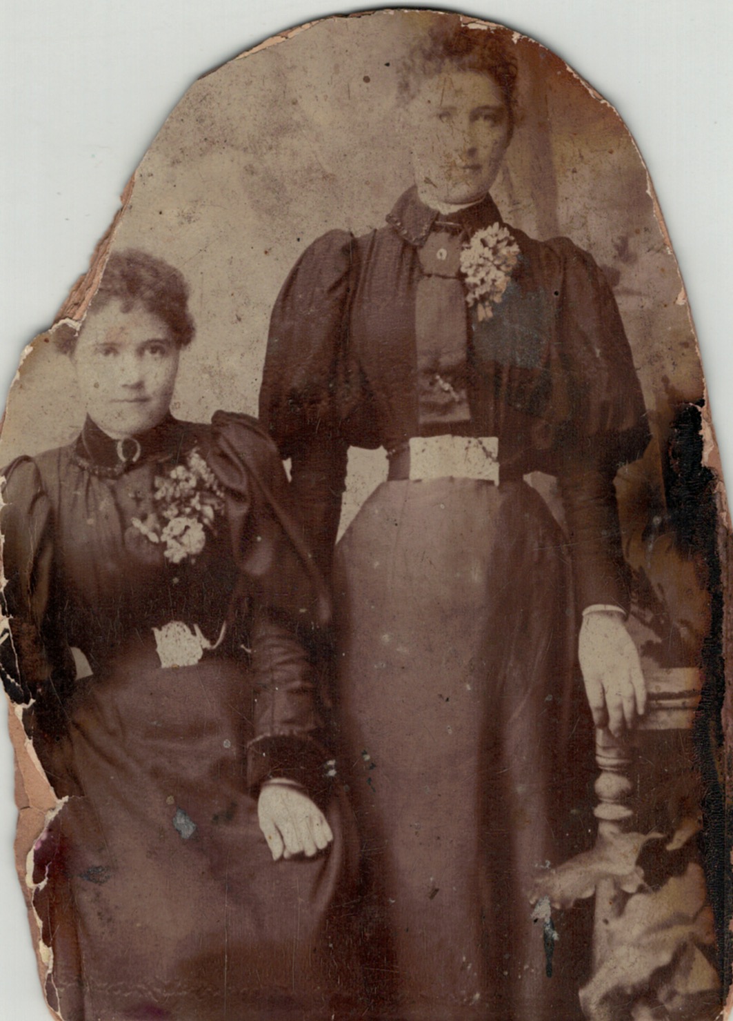 Bown sisters, Nellie (later Bawden, left) and Sarah (later Donehue); this photograph survived the Bawdenโs house fire at Rainbow. Vic., 1916, and may have been part of a larger group [June Schubert (Bawden)].