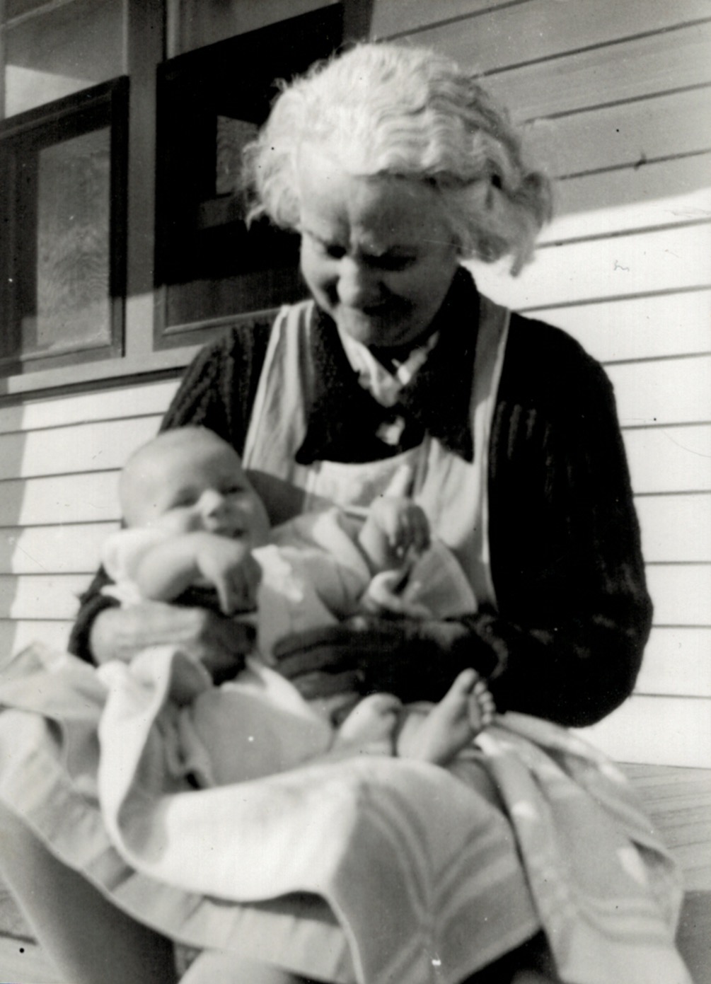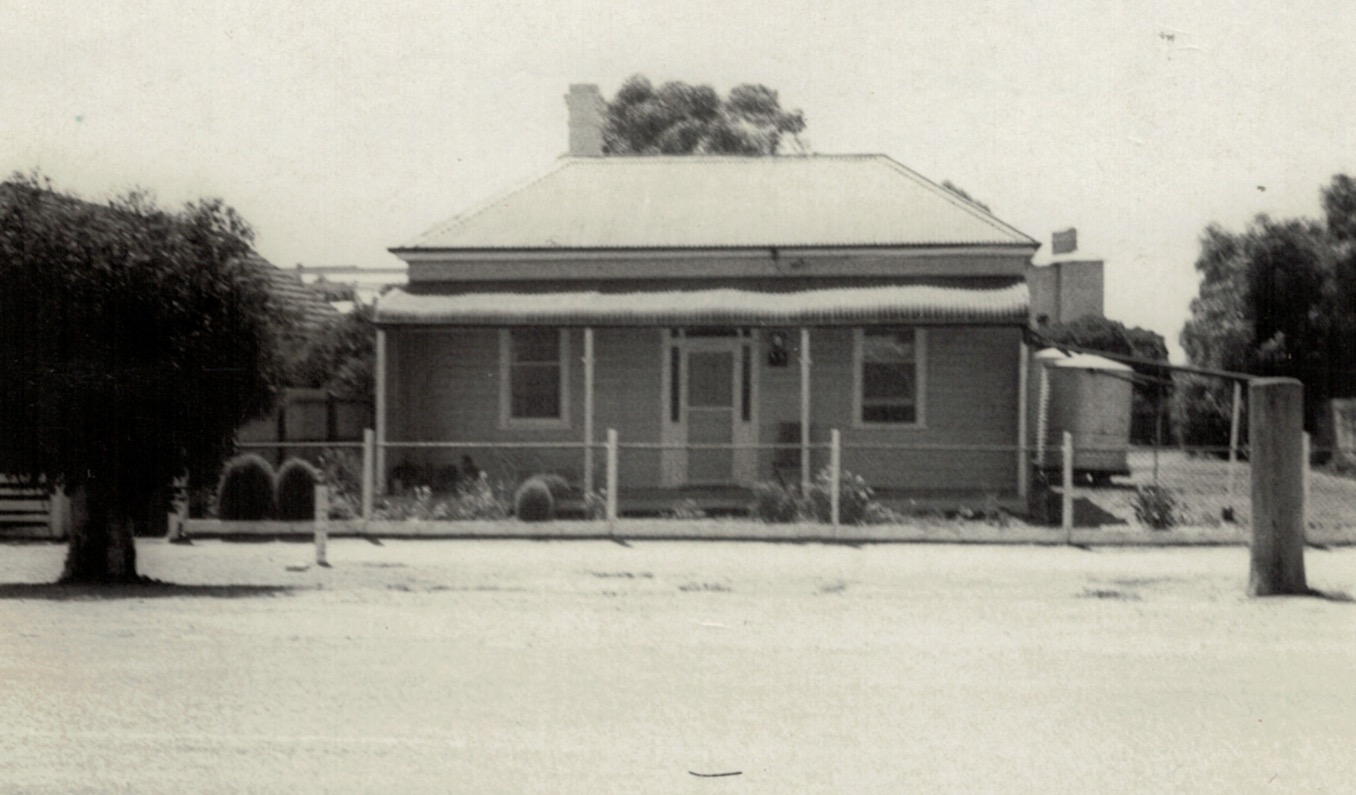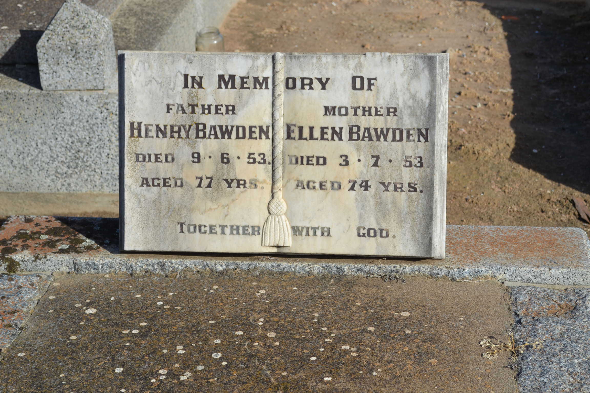 Staff of Thomas and Sons Flour Mill, Warracknabeal, 1934: Harry Bawden is standing ninth from the left, with Red Jaensch, his nephew by marriage, to his right. This photo was reproduced from the Warracknabeal 150th Anniversary Calendar, 2017 [Warracknabeal and District Historical Society].Nellie Bawden (Bown) with grandson John Schubert, Warracknabeal, Vic., c. 1949.Home of Harry and Nellie Bawden (Bown), Lyle Street, Warracknabeal Vic., 1945-53, photographed 1966 [JAS].Headstone for Harry and Nellie Bawden (Bown), Warracknabeal Cemetery, Vic. [Carol’s Headstone Photographs].