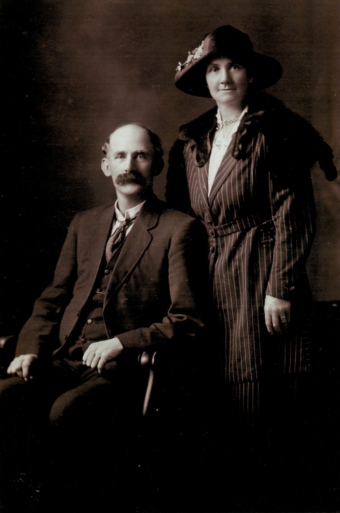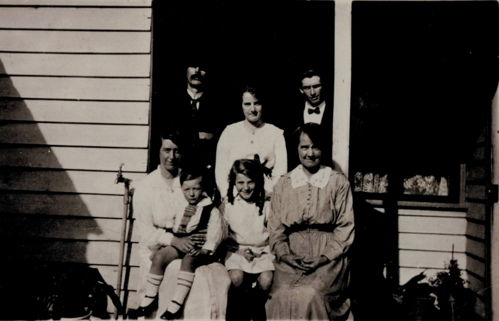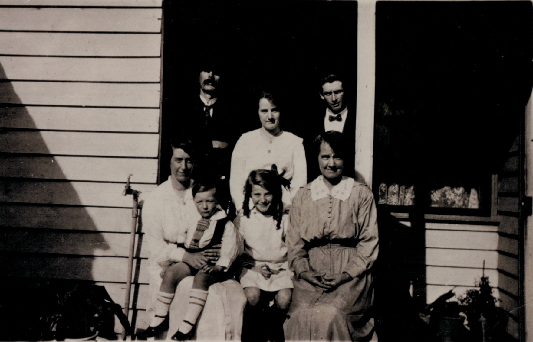 Nellie Bown (later Bawden), right, probably taken when she was a domestic at the Warracknabeal Hospital, Vic. (J. L. Discaciati, Warracknabeal); the other woman is possibly her sister Sarah (later Donehue) [Doff Mullan (Martin)].Bawden family group c. 1920/ standing L-R, Harry Bawden, Annie Martin (Bawden), Jack Martin; seated L-R, (woman and boy unknown), Hazel Bawden and Nellie Bawden (Bown) [Doff Mullan (Martin)].Harry and Nellie Bawden (Bown) [Doff Mullan (Martin)].