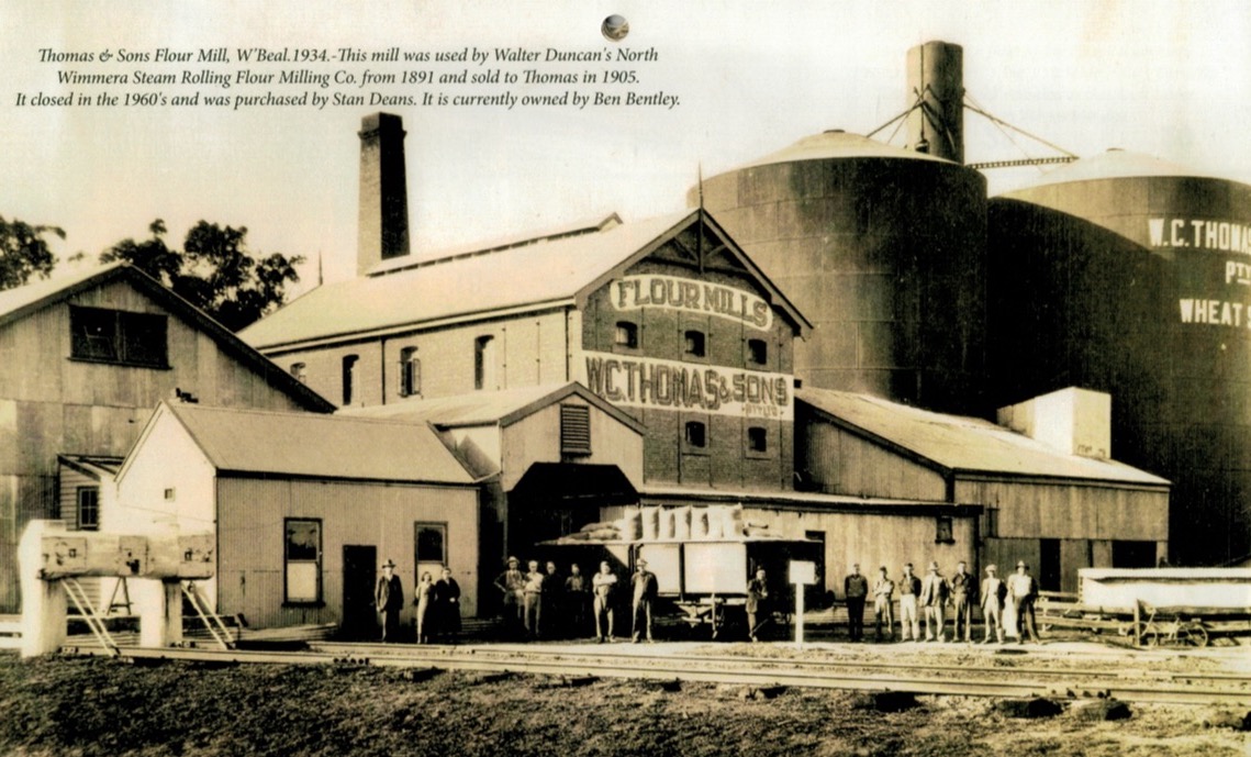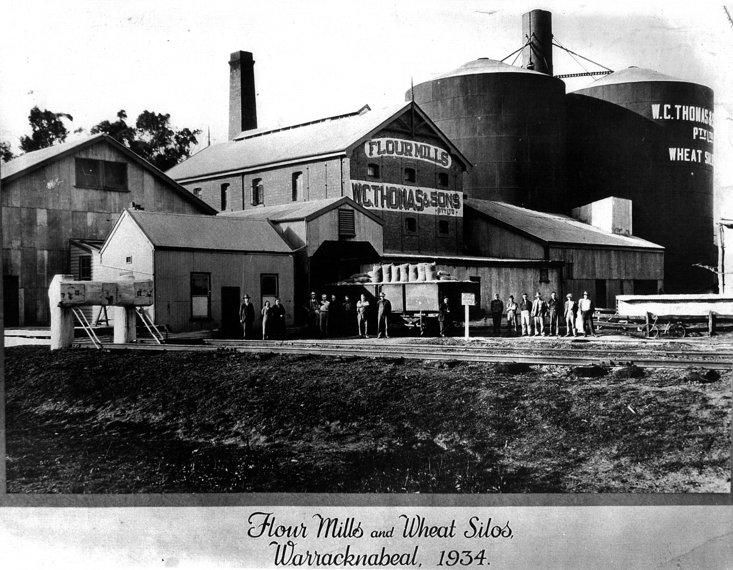 Employees of W. C. Thomas Flour Mill, Warracknabeal: Harry Bawden fourth from left, second row; to his left, his nephew by marriage, Red Jaensch [Warracknabeal and District Historical Society].