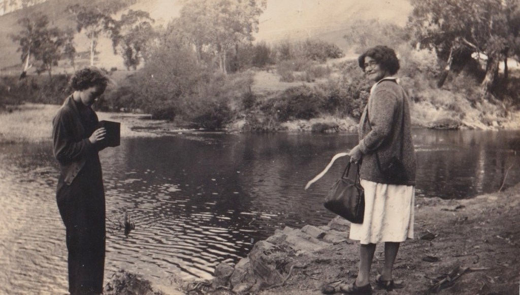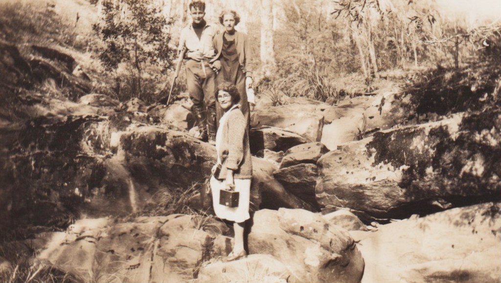 June Bawden (later Schubert) and Ev Bowen (Blachford), Grampians, Vic., c. 1940s [June Schubert (Bawden)].June Bawden (later Schubert) and Ev Bowen (Blachford), man unknown, Grampians, Vic., c. 1940s [June Schubert (Bawden)].