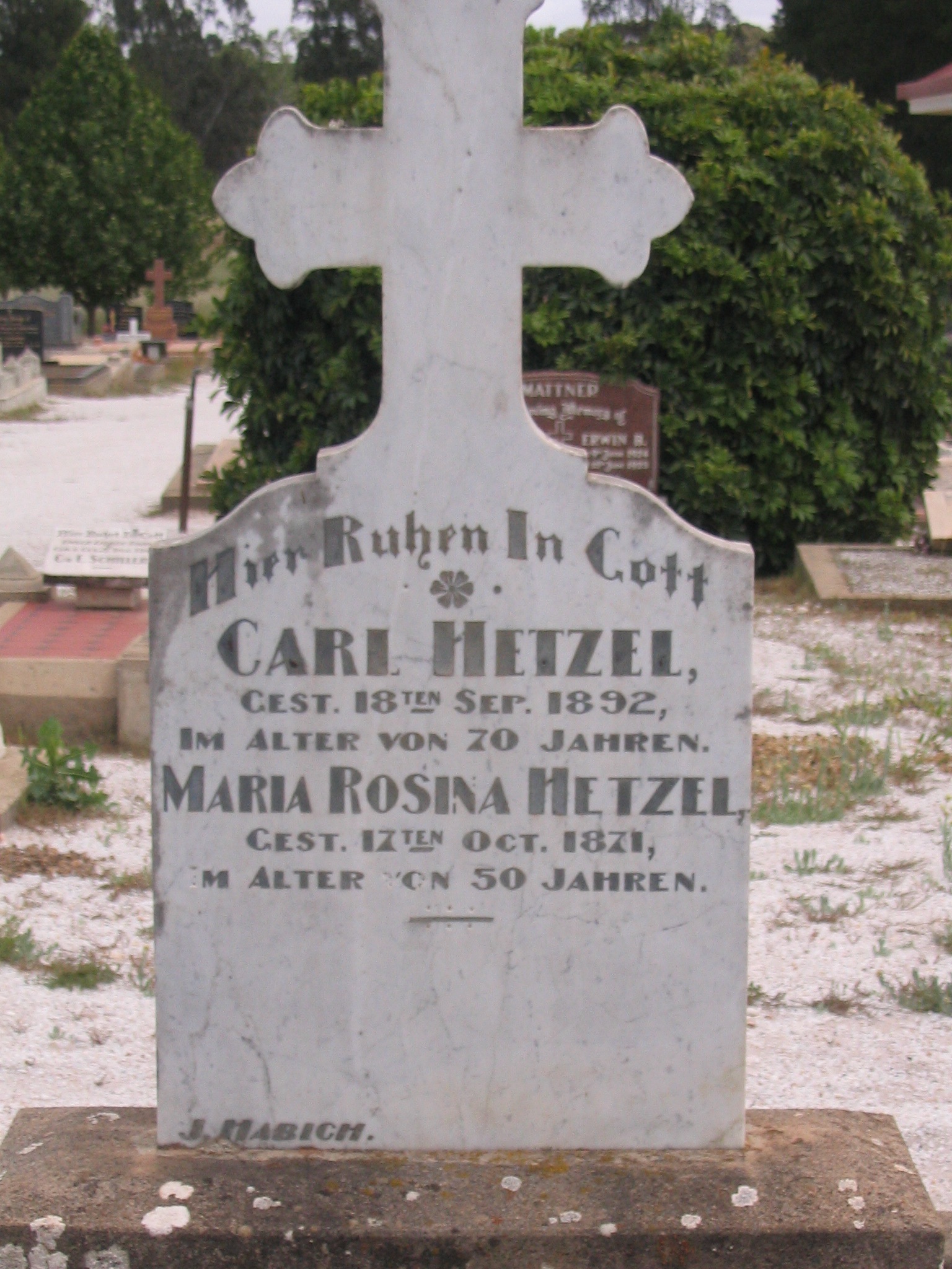 1.1 SCHACHE Maria Rosina (HETZEL) 1.1.1 HETZEL Maria Elizabeth (STRAUBE)1.1.2 HETZEL Carl Gottlob (Schwarztkopff)1.1.3 HETZEL Traugott Wilhelm (Nelson)1.1.4 HETZEL Anna Augusta (KOBELT)1.1.5 HETZEL Anna Emilie (HEINRICH)1.1.6 HETZEL Ernst Gottfried (Eberhard)1.1.7 HETZEL Friedrich Samuel (Martlew)1.1.8 HETZEL Caroline Emilie (SHARP) Grave of Carl & Maria Hetzel (Schache), St. John’s Cemetery, Tanunda, SA [JAS}.