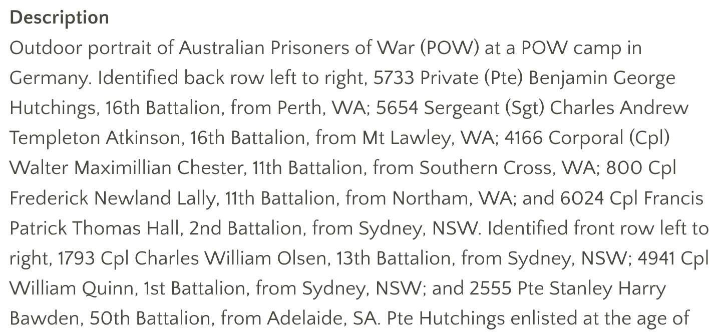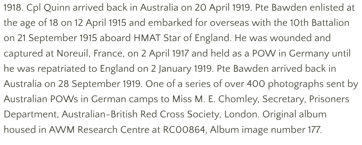 1.2.10 BAWDEN Stanley Harry (Halcrow/?) Published References (1.2.10 BAWDEN) Documents and Memorabilia (1.2.10 BAWDEN) Stanley Bawden, possibly taken while a POW Germany in WWI [WikiTree]. Stanley Bawden seated front right, POW Germany, June 1918. Catherine Bawden (Halcrow) [WikiTree]. Memorial plaque for Stanley Bawden, Celtenham Cemetery, SA Find a Grave].