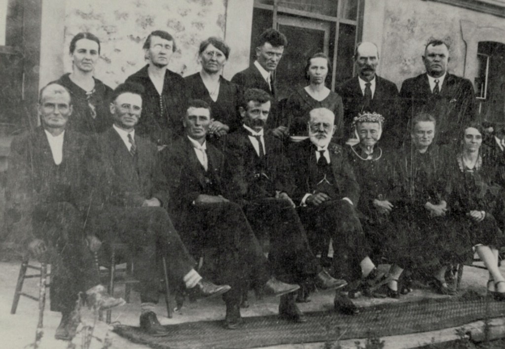 Gustav and Pauline Schubert (Schmidt), Silver Wedding, 1907 [Bert Geyer].Gustav and Pauline Schubert (Schmidt) and family: standing L-R, Alma Schubert (Kernich), Alwine Schubert (Bensch), Ida Schubert (Bensch), Fred Schubert, Ruby Schubert (Berndt), Julius Geyer, Ben Jaeschke; seated L-R, Paul Schubert, Bert Schubert, Emanuel Schubert, Jack Schubert, Gustav and Pauline, Ida Geyer (Schubert) and Selma Jaeschke (Schubert).