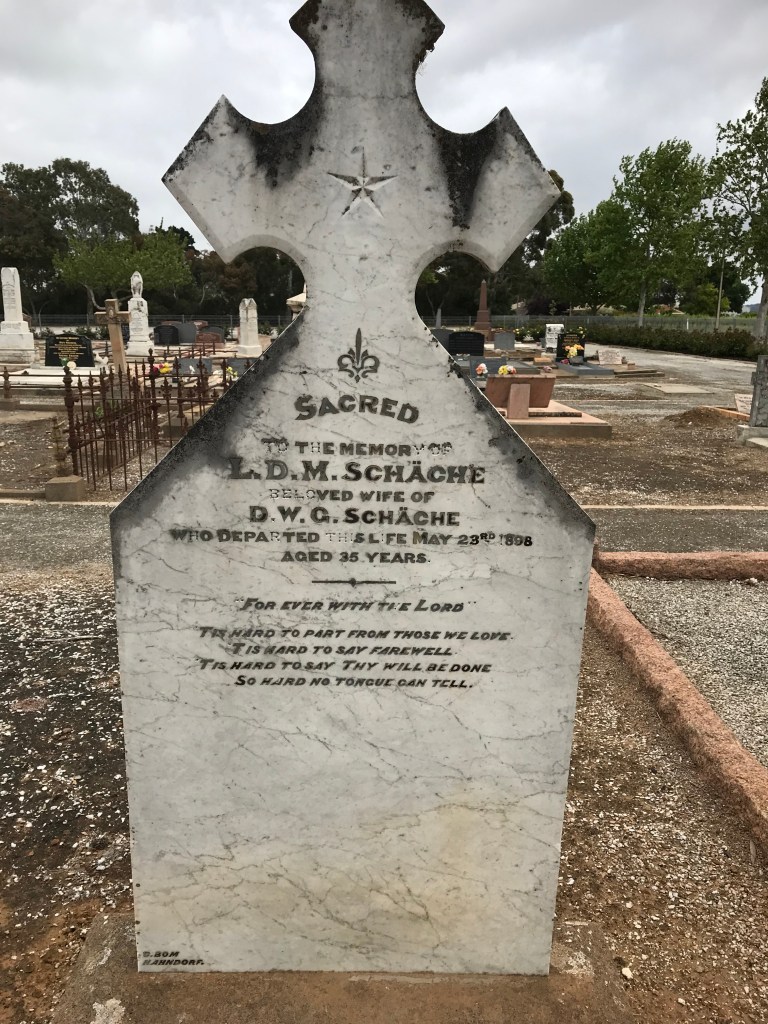 1.2.5 SCHACHE Daniel Wilhelm Gotthilf (Schmidt) 1.2.5.1 SCHACHE Adelhard Victoria1.2.5.2 SCHACHE Lina Alwine Victoria1.2.5.3 SCHACHE Bernhard Wilhelm1.2.5.4 SCHACHE Minna Alma Olga1.2.5.5 SCHACHE Laura Hilda1.2.5.6 SCHACHE Berthold Wilhelm Published References (1.2.5 SCHACHE) Headstone for Maria Schache (Schmidt), Angaston Cemetery, SA, 2019. Date of death should read 1897 [JAS].