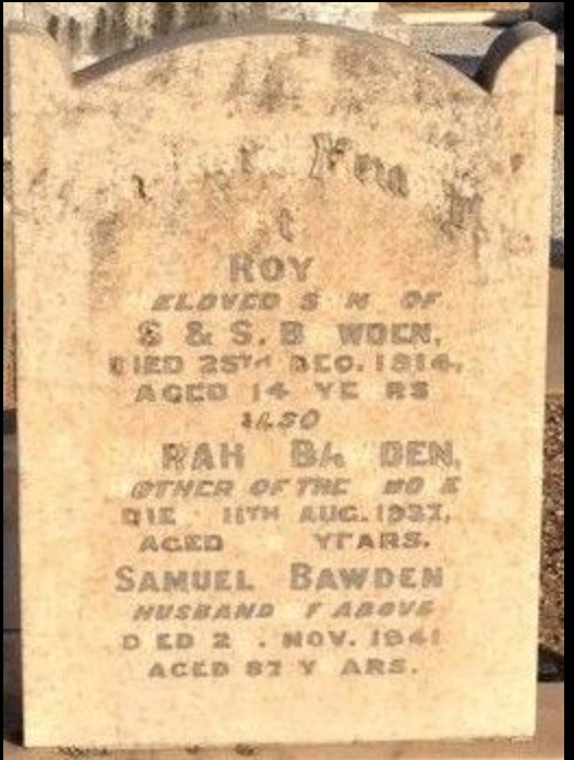 Headstone for Samuel and Sarah Bawden (Webb) and son Roy, Cheltenham Cemetery, SA [Find a Grave].