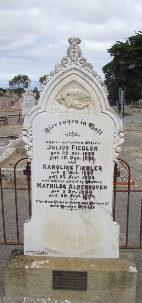 Headstone for Mathilde Aldenhoven (Fiedler) and Julius and Karoline Fiedler (Fiedler) (1.4 FIEDLER), Pink Lake Cemetery, Yorketown SA, 2020. Mathilde Aldenhoven and Julius Fiedler were siblings, and the headstone was obviously erected by Mathilde’s son and his wife who was Julius’s daughter [Don Ross].
