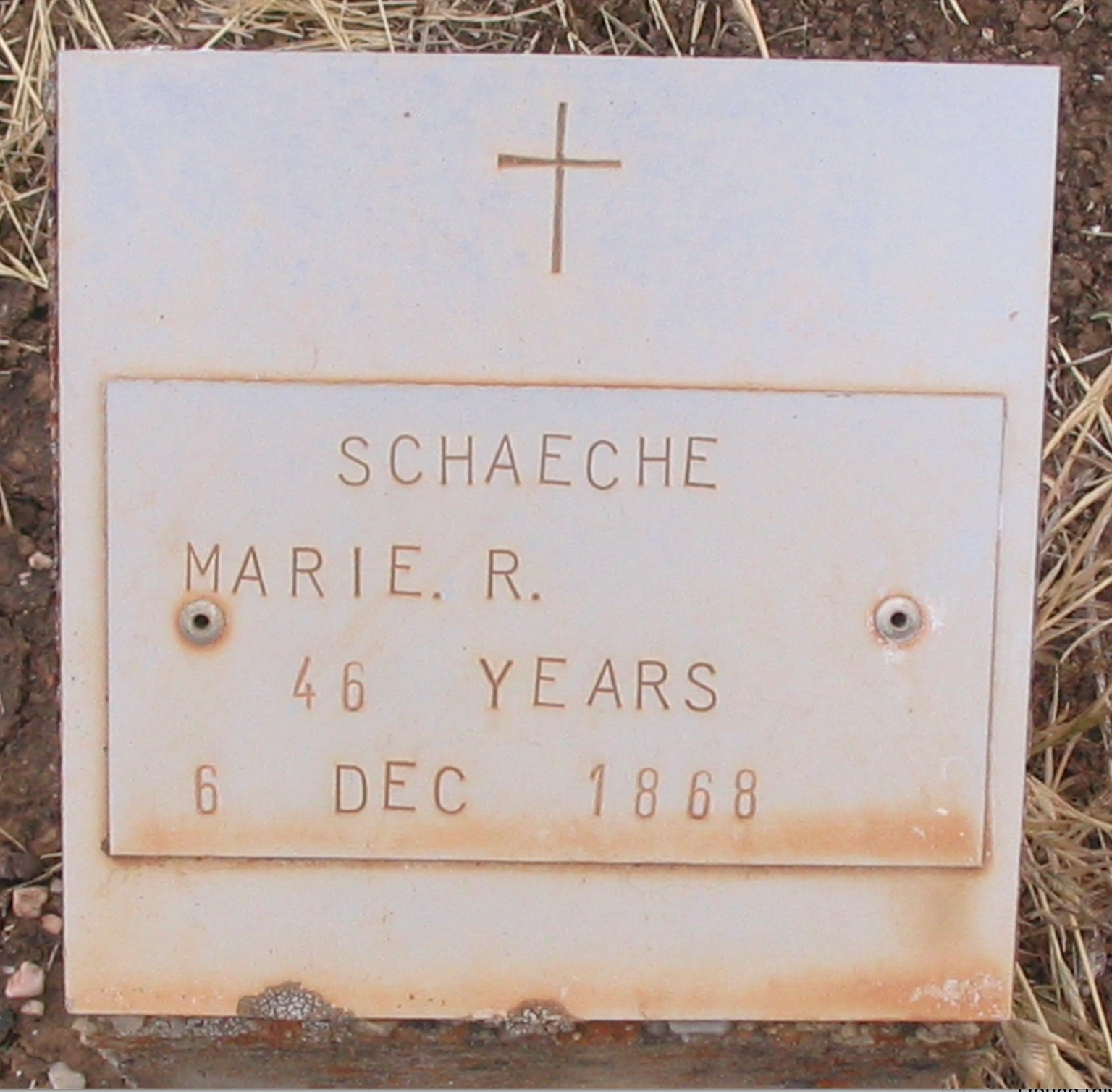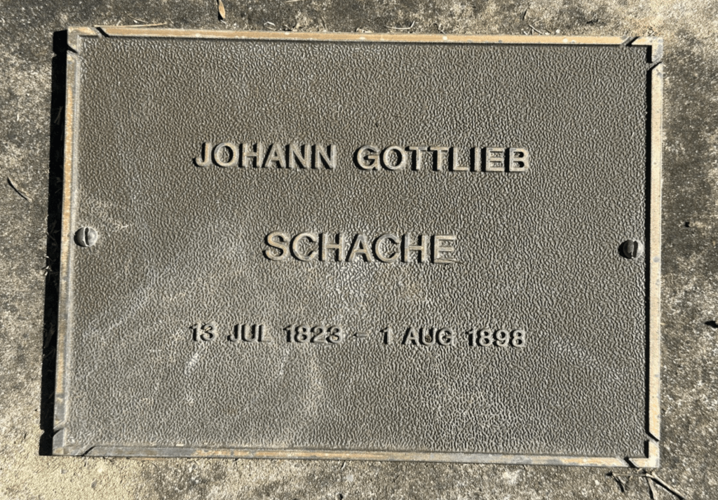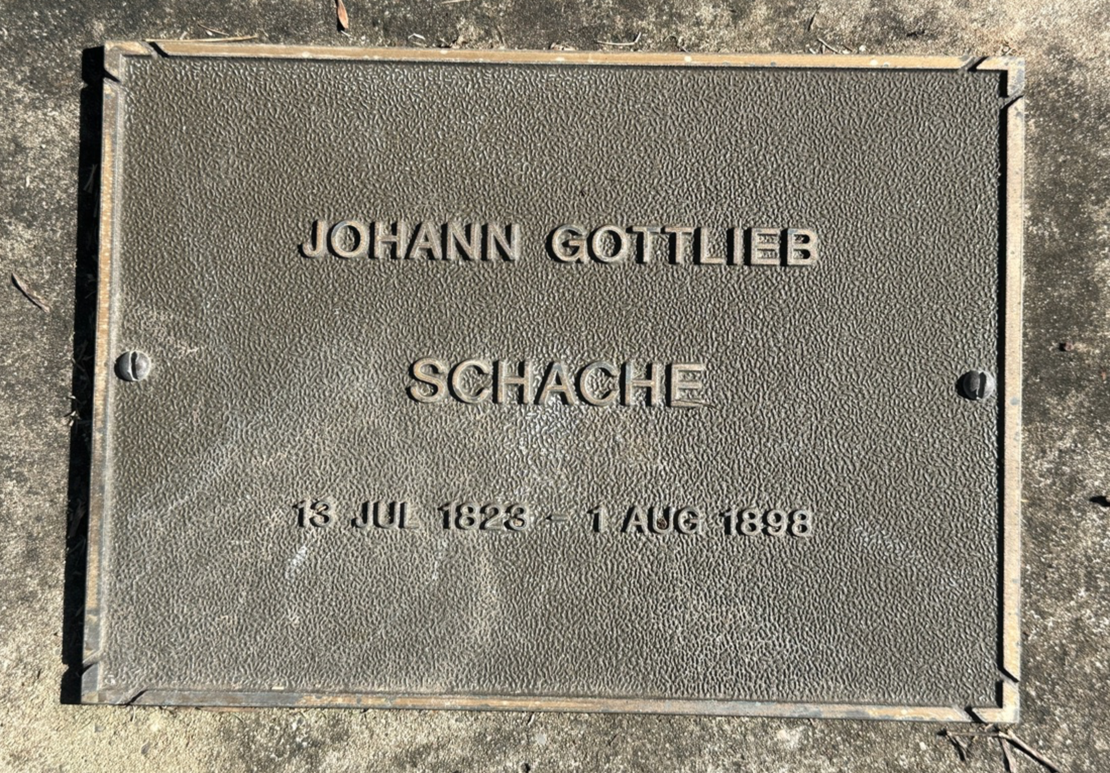 1.2 SCHACHE Johann Gottlieb (Ulbrich/Richter) 1.2.1 SCHACHE Gottlieb Ferdinand Julius (Munchenberg)1.2.2 SCHACHE Anna Martha Elisabeth (SEESSLE)1.2.3 SCHACHE Agnes Lydia (NENKE)1.2.4 SCHACHE Johannes Traugott Nathaniel (Ford)1.2.5 SCHACHE Daniel Wilhelm Gotthilf (Schmidt)1.2.6 SCHACHE Andreas Heinrich Benjamin (Selle)1.2.7 SCHACHE Amadeus Reinhold Immanuel (Schmidt)1.2.8 SCHACHE Minna Cecilia Marie (ISAACSON)1.2.9 SCHACHE Tobias Ludwig Samuel1.2.10 SCHACHE Johanne Regina Magdalena (ANDRES)1.2.11 SCHACHE Maria Henriette Clara1.2.12 SCHACHE Gottlieb Emanuel1.2.13 SCHACHE Henriette Clara Alwine1.2.14 SCHACHE Johann Friedrich Gotthard1.2.15 SCHACHE Paul Bernhard Theophilus1.2.16 SCHACHE Pauline Laura Colestina1.2.17 SCHACHE Johannette Florentine Pandora (McCANN)1.2.18 SCHACHE Susanna Medea Collestina (DAVEY)1.2.19 SCHACHE Carl Otto Cornelius1.2.20 SCHACHE Ernst Gottlob Opertus1.2.21 SCHACHE Phillipine Gertrude Neiopina Published References (1.2 SCHACHE) Documents and Memorabilia (1.2 SCHACHE) Grave marker for Rosina Schache (Ulbrich), Gnadenfrei (St. Michael’s) Lutheran Cemetery, Marananga, SA [JAS]. Grave marker for Gottlieb Schache, Lutwyche Cemetery, Kedron, Qld [David Schache]. Headstone for Paulina Schache (Richter), West Terrace Cemetery, Adelaide, SA, and her daughter Pandora McCann (Schache) [Billion Graves].