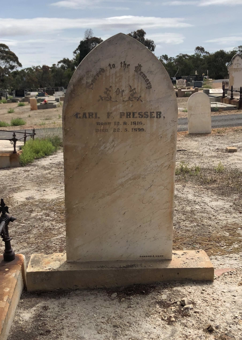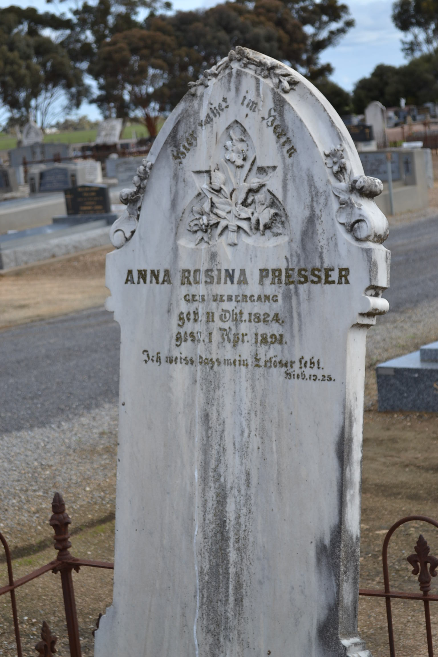 1.2 UEBERGANG Anna Rosina (PRESSER) 1.2.1 PRESSER Carl (Gulbin)1.2.2 PRESSER Mary (MULLER)1.2.3 PRESSER Edward (Tschirner)1.2.4 PRESSER Anna Louisa (TOWK)1.2.5 PRESSER John (GUST)1.2.6 PRESSER Caroline (NUSKE)1.2.7 PRESSER Henry (Gust)1.2.8 PRESSER August (Burger)1.2.9 PRESSER Ernest (Oulton/Gordon)1.2.10 PRESSER Louisa Matilda (KENNEDY) Published References (1.2 UEBERGANG) Documents and Memorabilia (1.2 UEBERGANG) Headstone for Anna Presser (Uebergang), Murtoa Cemetery, Vic. [Carol’s Headstone Photographs]. Headstone for Carl Presser, Stawell Pleasant Creek Public Cemetery, Vic. [Find a Grave]. Detail of headstone for Carl Presser, Stawell Pleasant Creek Public Cemetery, Vic. [Find a Grave].
