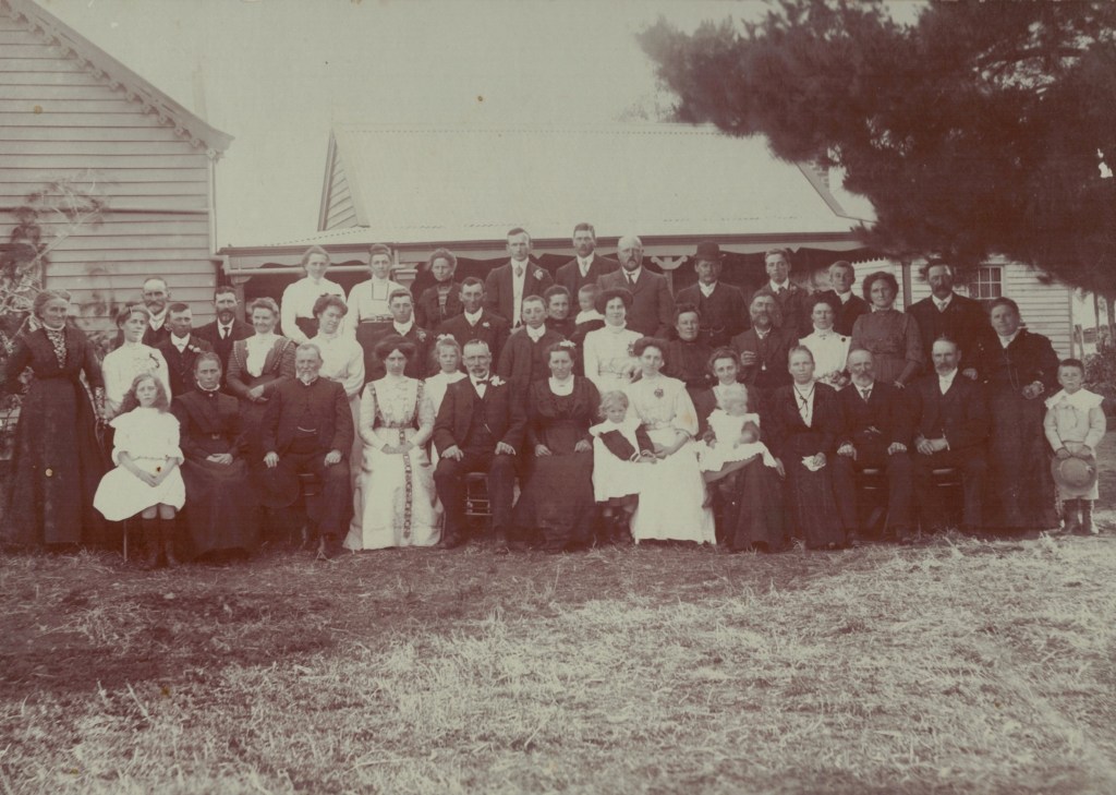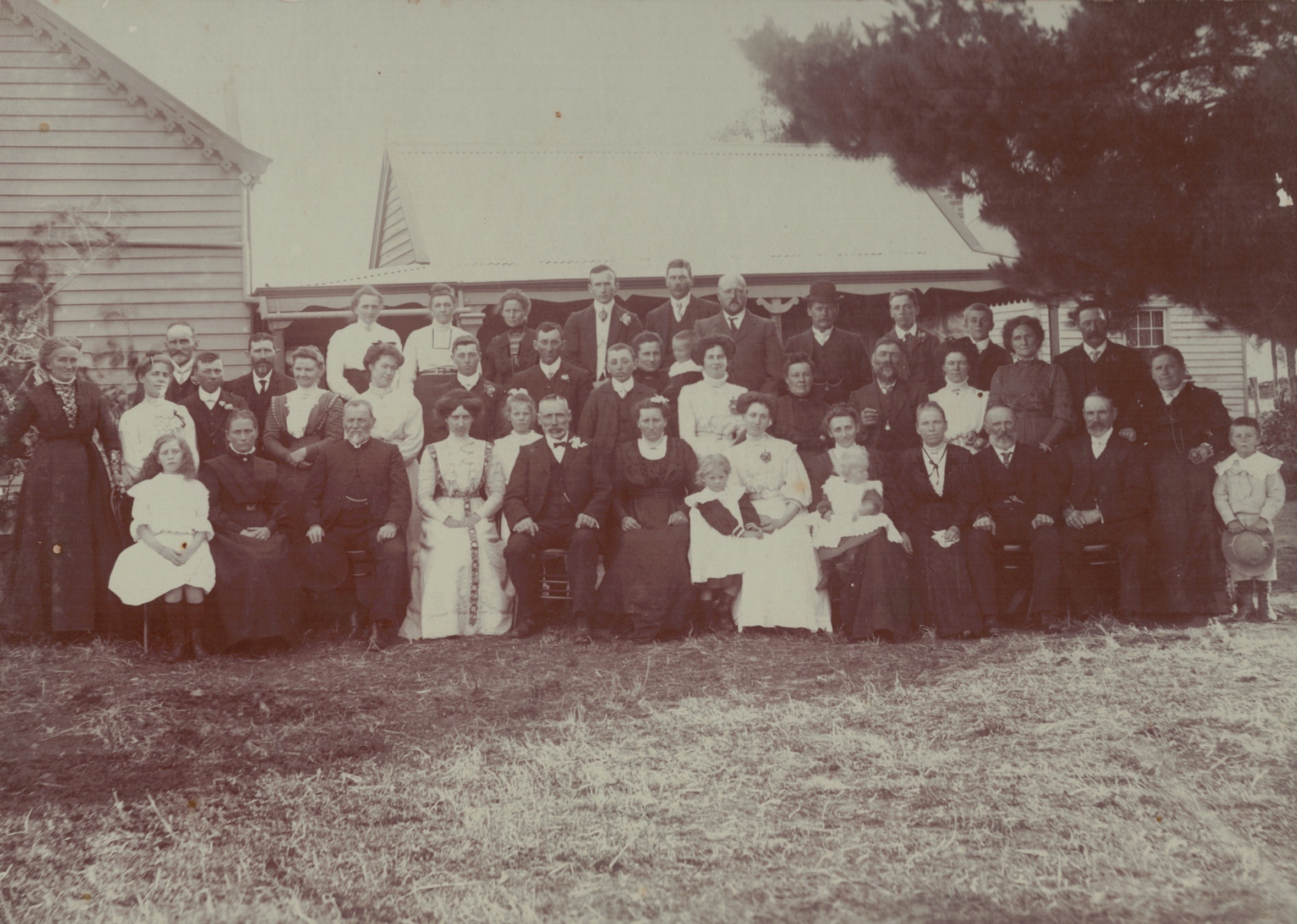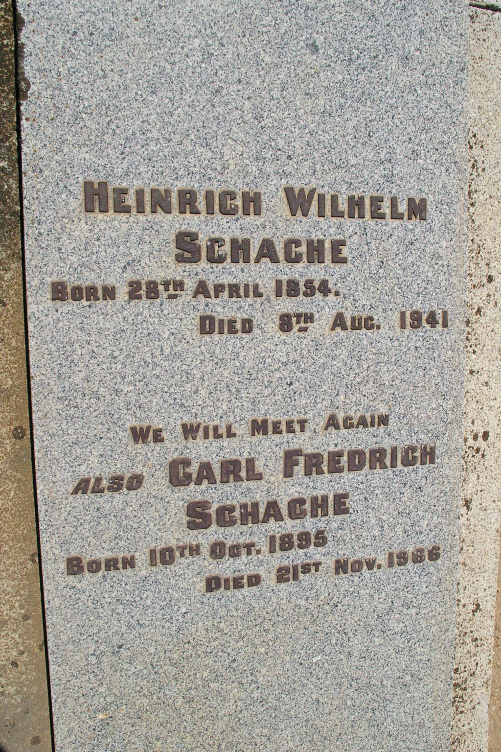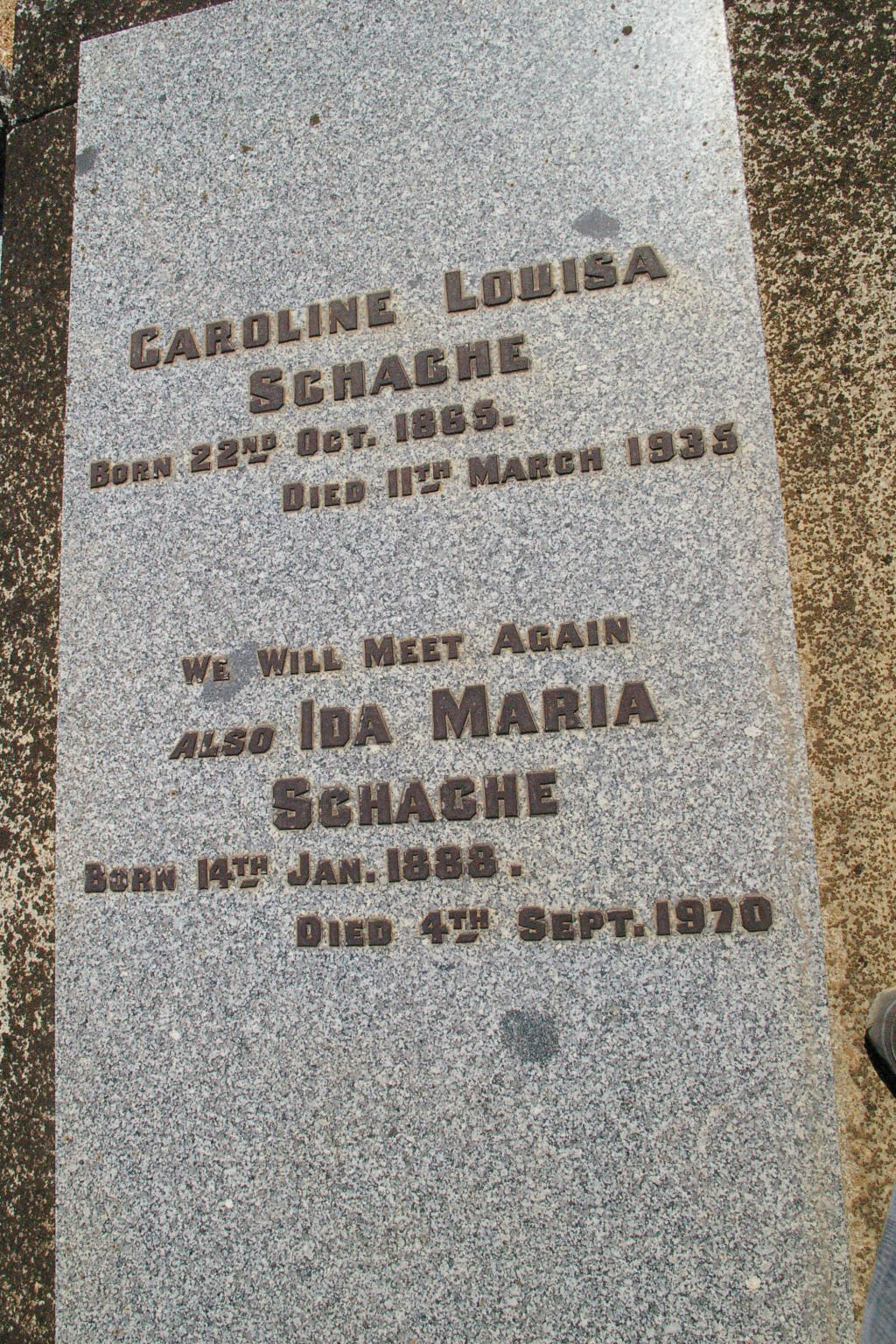 Harry and Lena Schache (Pluckhahn), bridal photograph (C. B. Herbert, Stawell and Horsham, Vic.) [Winnie Schubert(Adler)].Harry and Caroline Schache (Pluckhahn) and children, silver wedding anniversary, “Vermont Farm”, Jung North via Murtoa Vic., 1910: standing L-R, Alf Schache, Caroline Harnath (Schache), Ida Schache and Fred Schache; seated, Harry and Caroline.Harry and Caroline Schache (Pluckhahn), silver wedding anniversary guests, “Vermont Farm”, Jung North via Murtoa Vic., 1910.Headstone for Harry Schache and son Fred, Murtoa Cemetery Vic. [Carol’s Headstone Photographs].Headstone for Caroline Schache (Pluckhahn) and daughter Ida, Murtoa Cemetery Vic. [Carol’s Headstone Photographs].