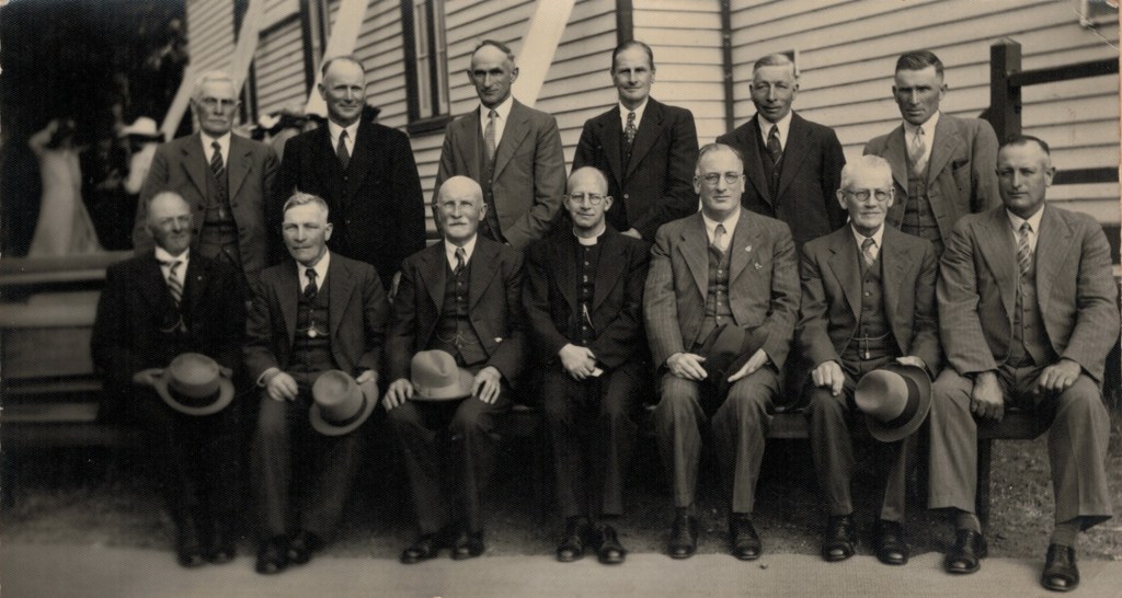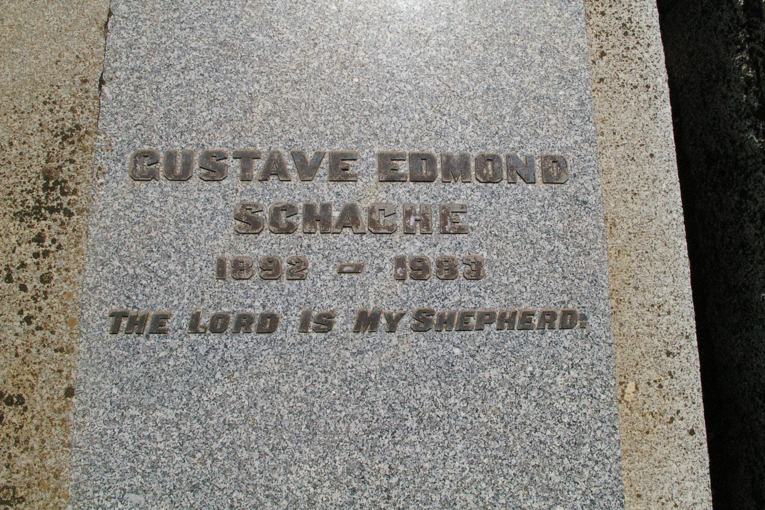 1.3.6.1 SCHACHE Gustav Edmund Published References (1.3.6.1 SCHACHE Documents and Memorabilia (1.3.6.1 SCHACHE) St. John’s Church, Murtoa, Vic. (Pastor J. M. Larsen), 1940s; Eddie Schache seated far left; Ossie Schache, standing fourth from left; [Tess Hausler (Schache)]. Grave of Eddie Schache, Murtoa Cemetery, Vic. [Carol’s Headstone Photographs].