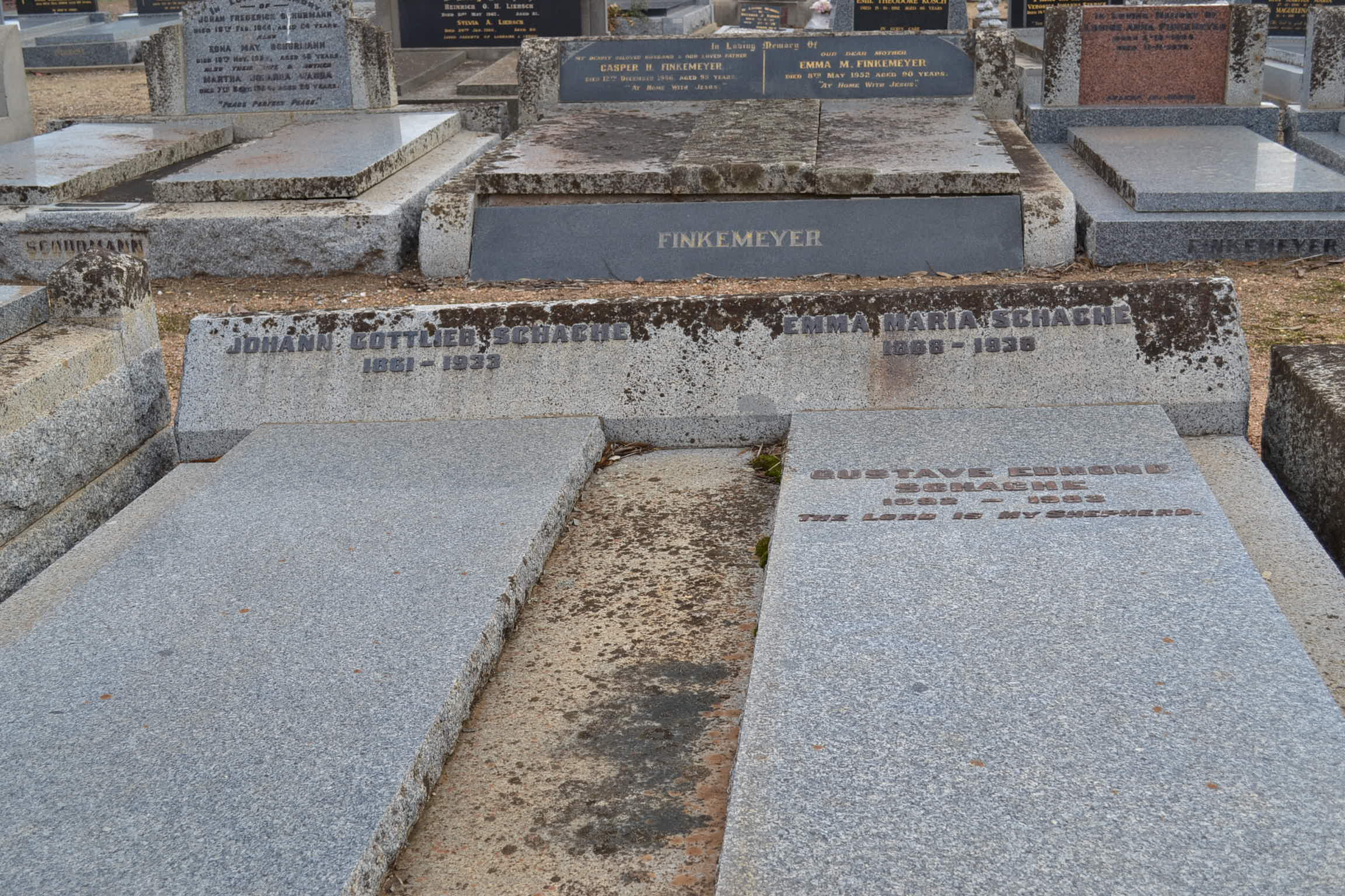 Gottlieb and Emma Schache (Schulz), wedding 1891 (Willetts Elite Studios, Sturt St., Ballarat) [Glenda Ruwoldt].Home of Gottlieb and Emma Schache (Schulz), “Mayfair”, Jung North via Murtoa Vic.; Emma with the children and Gottlieb leaning against the veranda post to the left [Mark Schache].Gottlieb and Emma Schache (Schulz), seated centre with (Adler) nieces and nephews: standing Minnie and August Schubert; seated far left Fred and Bertha Schache; seated far right, Henry; Cissie sitting foreground; โMayfairโ, Jung North via Murtoa Vic. [David Schache].Group with Gottlieb and Emma Schache (Schulz): standing L-R, unknown, Eddie Schache, Gottlieb, Carl Adler, Ossie Schache; seated L-R, Selma Schache (Adler), Emma, unknown; Schache sons with unknown women on ground.Gottlieb and Emma Schache (Schulz) and children, “Mayfair”, Jung North via Murtoa Vic.: standing L-R: Frank, Carl, Lydia Petering (Schache), Vic, Eddie; seated L-R, Ernie, Gottlieb, Walter and Emma.Silver wedding anniversary of Gottlieb and Emma Schache (Schulz), “Mayfair”, Jung North via Murtoa Vic., 1916.Grave of Gottlieb and Emma Schache (Schulz) and son Eddie, Murtoa Cemetery Vic. [Carol’s Headstone Photographs].