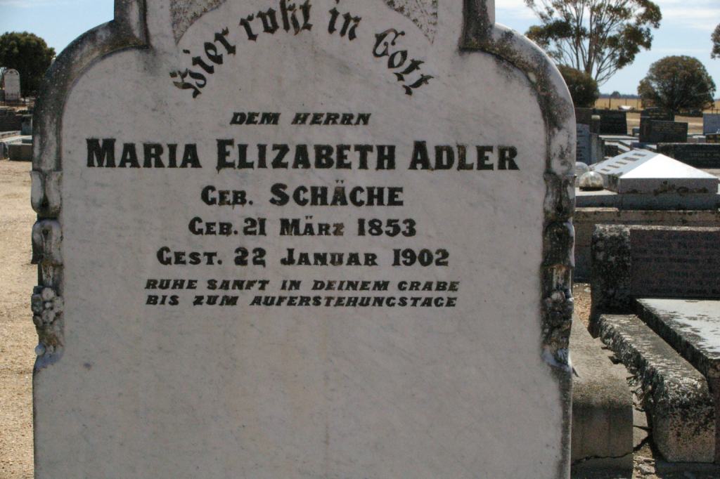 Headstone for Lizzie Adler (Schache), Murtoa Cemetery, Vic. Also buried in this grave are Fred Adler, Annie Adler (Schache) and Ciss Adler [Carol’s Headstone Photographs].