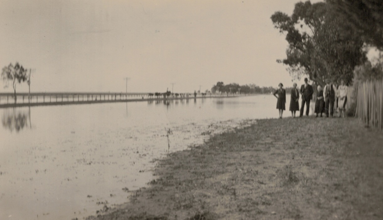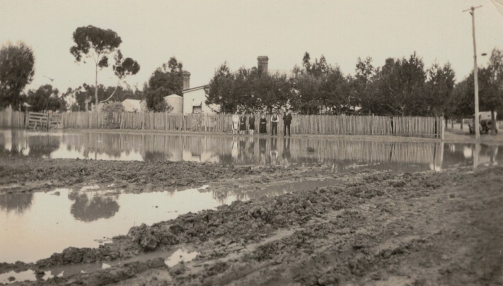 Flood waters on the corner of Minyip Road/Comyn Street, Murtoa (Adler’s house), c. early 1930s: L-R, Tess Schache (later Hausler), Bertha Schache (Adler), Fred Schache, Annie Adler (Schache), Fred Adler and Ciss Adler [Tess Hausler (Schache)].