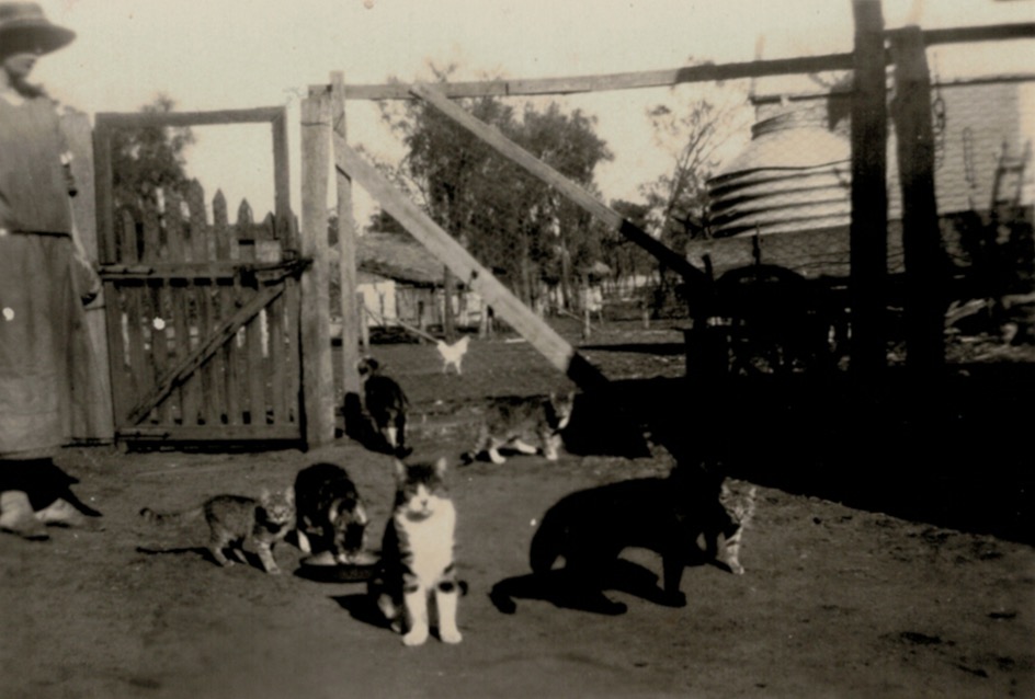 “Sheoak Bank”, Coromby via Murtoa, Vic., 1920s; family of seven cats [Tess Hausler (Schache)].
