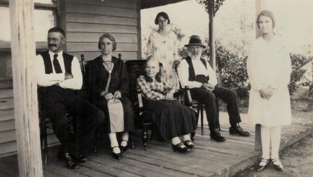 “Sheoak Bank”, Coromby via Murtoa, Vic., 1920s; L-R, Fred Schache, Bertha Schache (Adler), Annie Adler (Schache), ,Tess Schache (later Hausler), Fred Adler, Mary Schache (later Schubert) [Tess Hausler (Schache)].