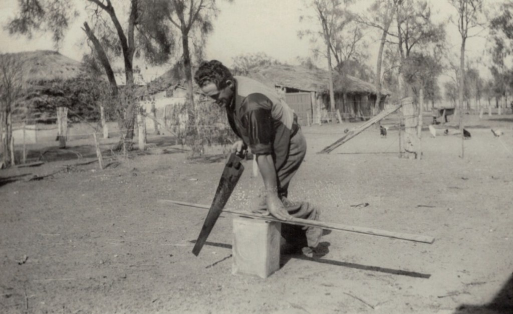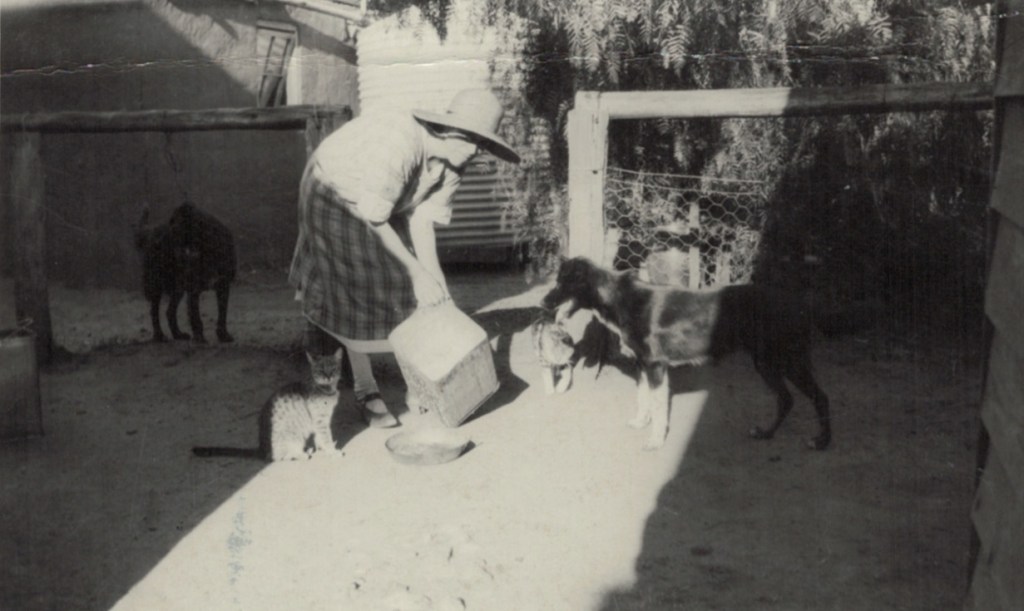 Ciss Adler feeding the animals at “Sheoak Bank”, Coromby via Murtoa, Vic., 1920s [Tess Hausler (Schache)].