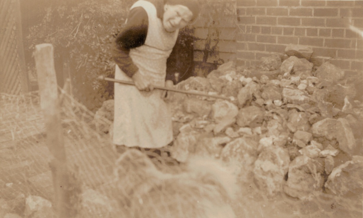 Inscription on reverse of PhotographFred Adler with grandson Sig Schubert (left) and unknown, Comyn Street Murtoa, Vic., 1936 [Tess Hausler (Schache)]Fred and Annie Adler (Schache), probably at Comyn Street, Murtoa, Vic.Annie Adler (Schache) and Syme the dog at the rockery, Comyn Street, Murtoa, Vic., c. 1940. [Winnie Schubert (Adler)].
