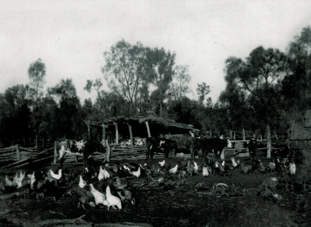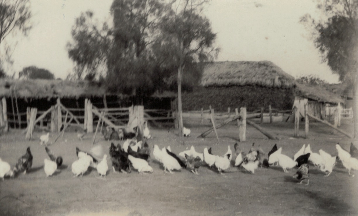 Ciss Adler’s fowls by the hay stacks, “Sheoak Bank”, Coromby via Murtoa, Vic., 1920s [Tess Hausler (Schache)].