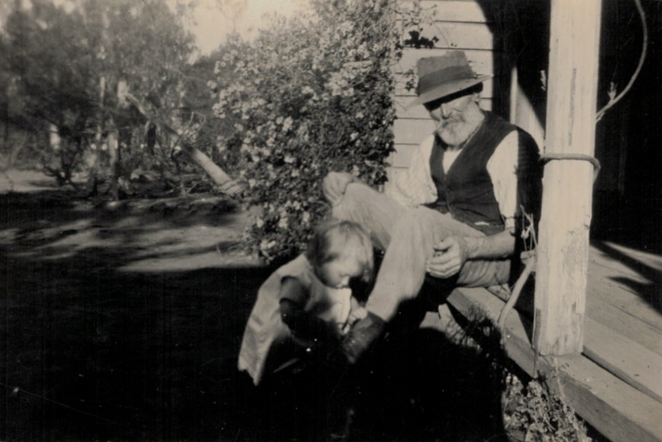 Fred Adler and grand-daughter Irma Schache (later Russell), “Sheoak Bank”, Coromby via Murtoa, Vic., 1920s [Tess Hausler (Schache)].