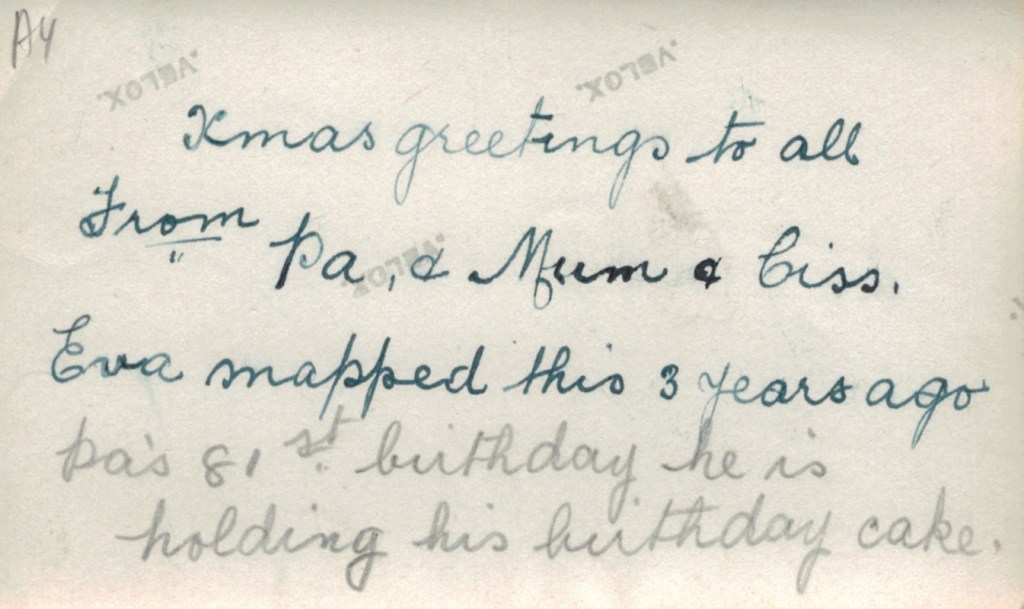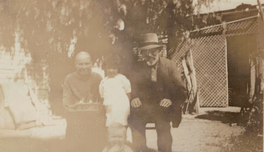 Fred and Annie Adler (Schache) on Fred’s 81st birthday, February 1931, Comyn Street, Murtoa, Vic., with Josie and Gordon Adler [Tess Hausler (Schache)].
