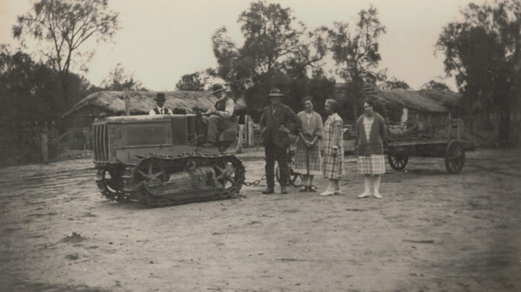 Holt tractor at “Sheoak Bank”, Coromby via Murtoa Vic., 1920s: L-R, Fred Schache, Fred Adler, unknown, Ciss Adler, Bertha Schache (Adler), Tess Schache (later Hausler) [Tess Hausler (Schache)].