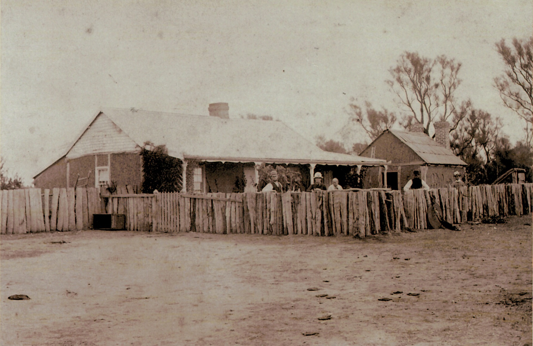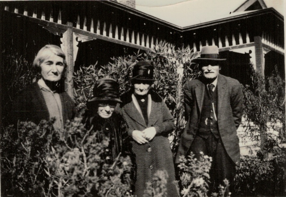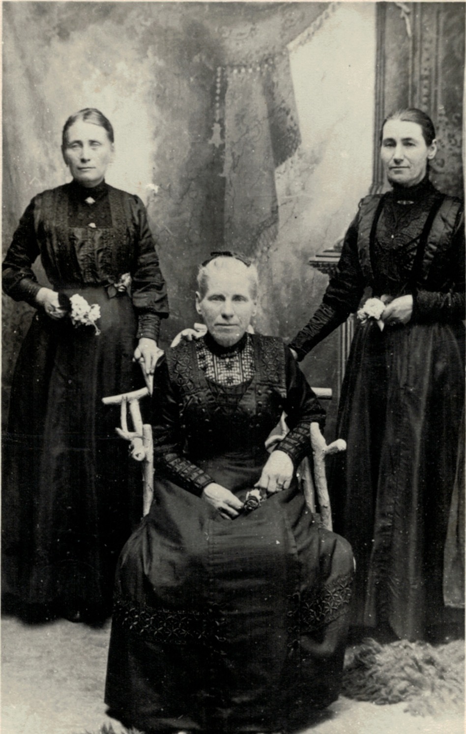 Schache homestead, โSandergroveโ, Box Flat via Murtoa Vic.; woman third from left believed to be Maria Schache (Schubert); others L-R are possibly Charlie Reinecke, Susan Renecke (Schache), Dan Schache and Lena Schache (Schache) [Mark Schache].Schache siblings: L-R, Susan (Reinecke), Annie (Adler) and Lena (Schache) [Murtoa Centenary order].
