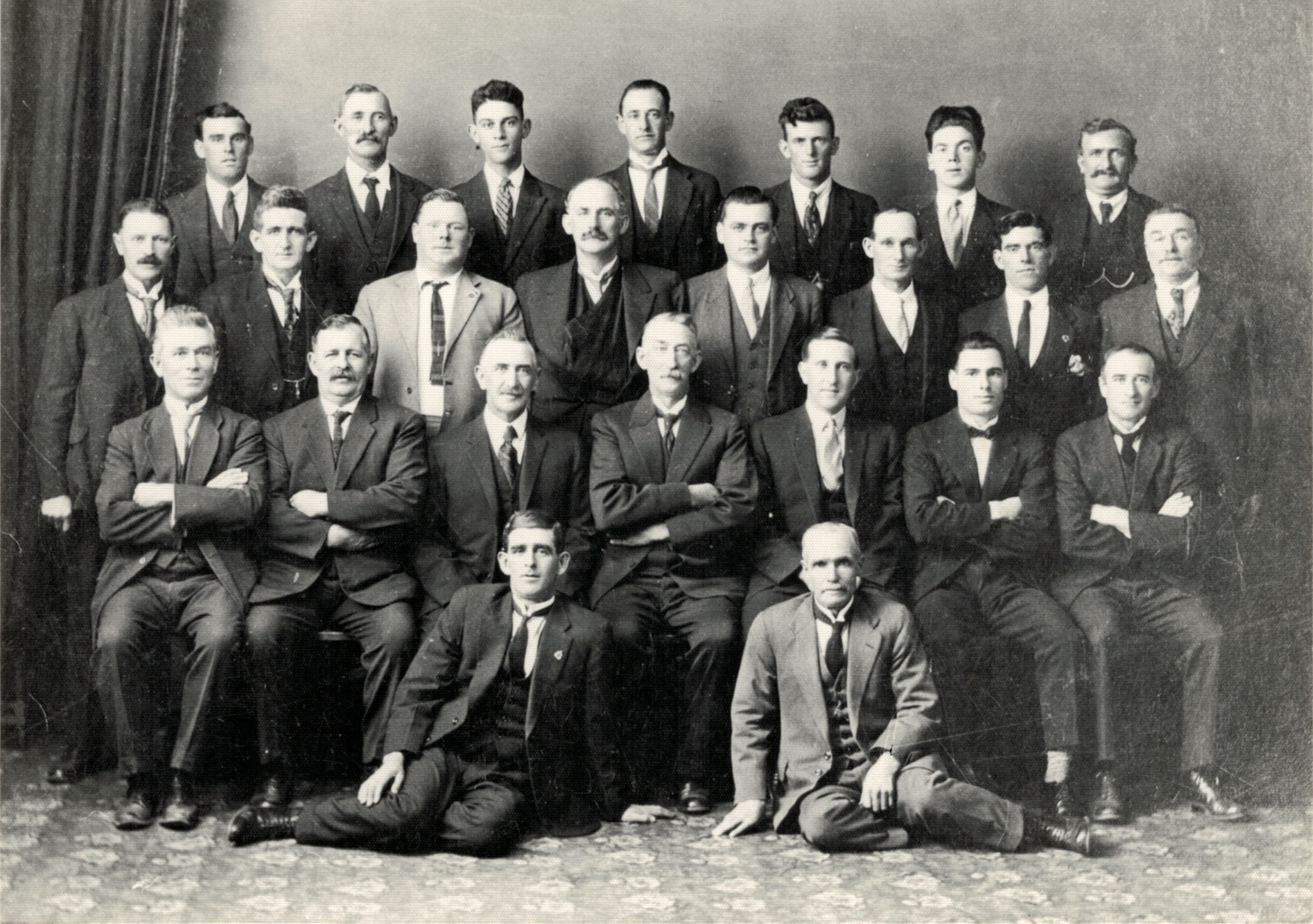 Employees of W. C. Thomas Flour Mill, Warracknabeal: Red Jaensch, second row, third from left (his wife’s uncle, Harry Bawden, fourth from left in the same row) [Warracknabeal and District Historical Society].