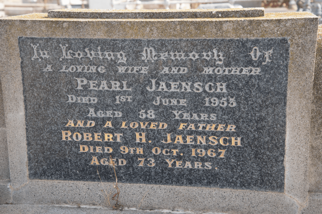Headstone for Red and Pearl Jaensch (Trew), Warracknabeal Cemetery, Vic. [Find a Grave].