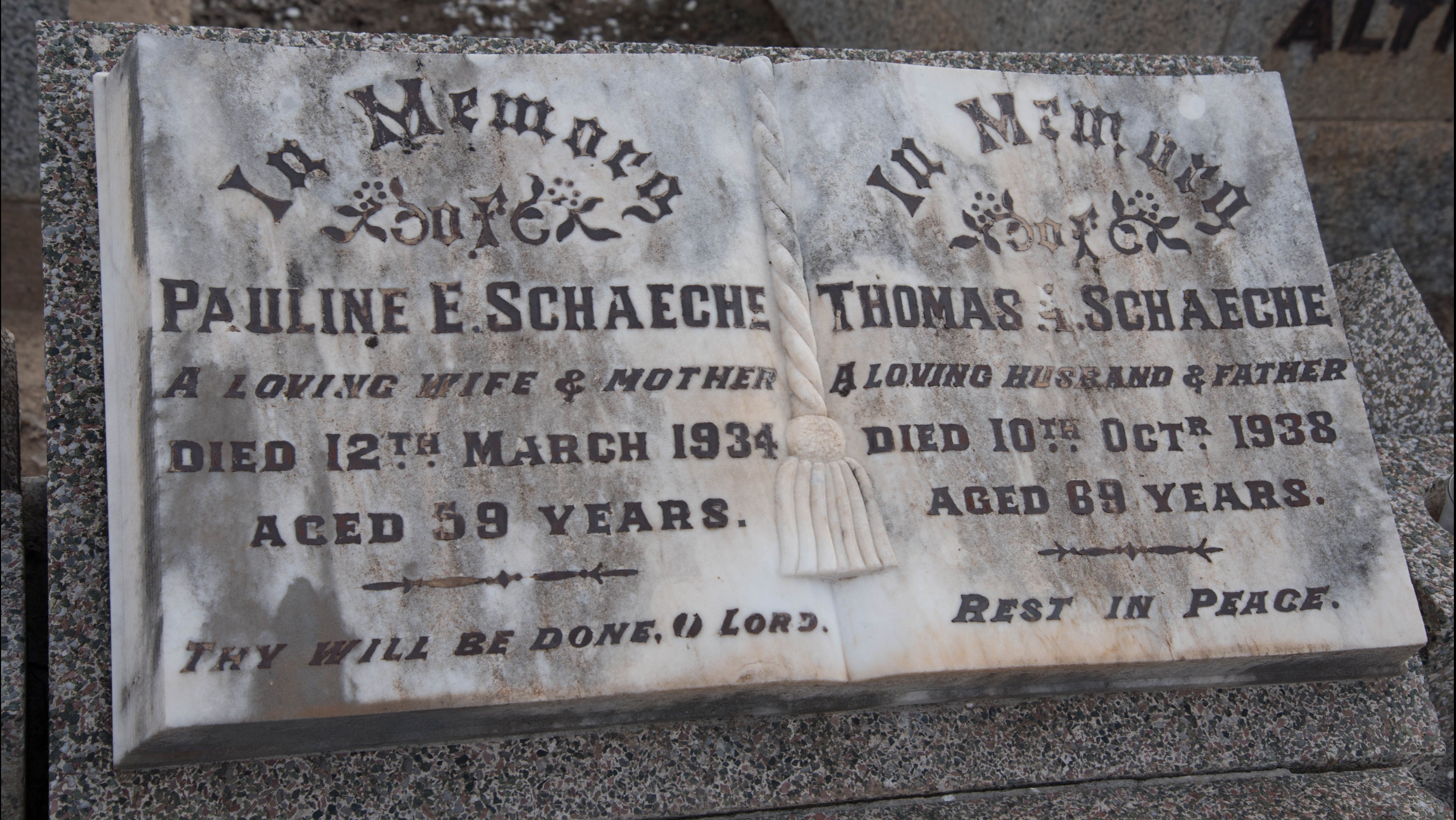 1.4.4 SCHAECHE Thomas Alfred (Aumann) 1.4.4.1 SCHAECHE Clara Eleonora Elizabeth (McRAE)1.4.4.2 SCHAECHE Henry Alfred (Patullo)1.4.4.3 SCHAECHE Ernst Frederick1.4.4.4 SCHAECHE Percy Edward (Foran nee Murray)1.4.4.5 SCHAECHE Hilda Emma May1.4.4.6 SCHAECHE Herbert Leslieย (Henman)1.4.4.7 SCHAECHE Oscar Albert (Crittenden)1.4.4.8 SCHAECHE Elsie Anna Victoria (MILNE)1.4.4.9 SCHAECHE Frank William1.4.4.10 SCHAECHE George Thomas (Brophy nee Kinnane)1.4.4.11 SCHAECHE Charles Gordon Kitchener (Witney)1.4.4.12 SCHAECHE Norman Published references (1.4.4 SCHAECHE) Alf Schache. Headstone for Pauline and Thomas Schaeche (Aumann), Warracknabeal Cemetery, Vic. [Find a Grave].