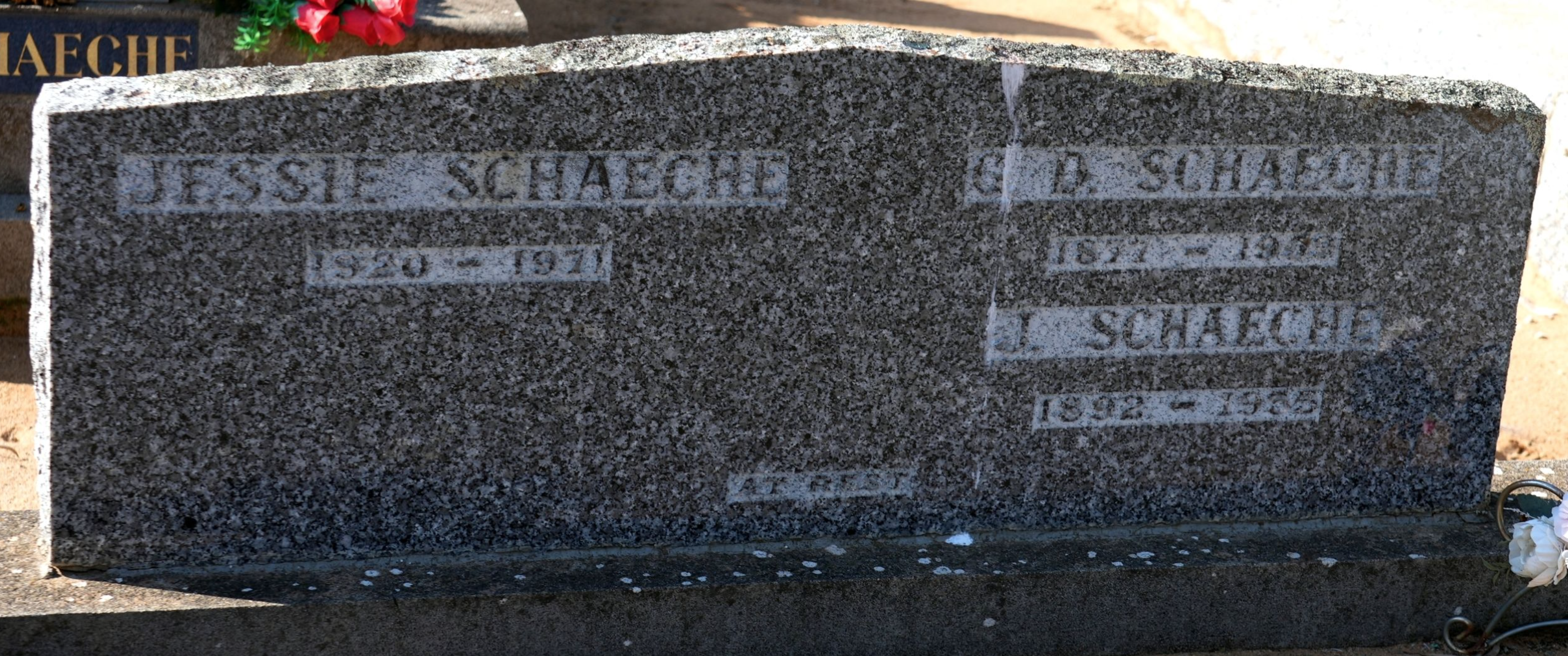 1.4.8 SCHAECHE Gottlob David (Robinson) 1.4.8.1 SCHAECHE Percy Edwin1.4.8.2 SCHAECHE David1.4.8.3 SCHAECHE Jean (OWEN)1.4.8.4 SCHAECHE Jessie1.4.8.5 SCHAECHE Pearl (WHITTY)1.4.8.6 SCHAECHE Doreen (NONNIBALL)1.4.8.7 SCHAECHE Esma (BARTETT)1.4.8.8 SCHAECHE David James (Knapman)1.4.8.9 SCHAECHE Albert Headstone for Davey and Jean Schaeche (Robinson), Tocumwal Cemetery, NSW (Find a Grave).