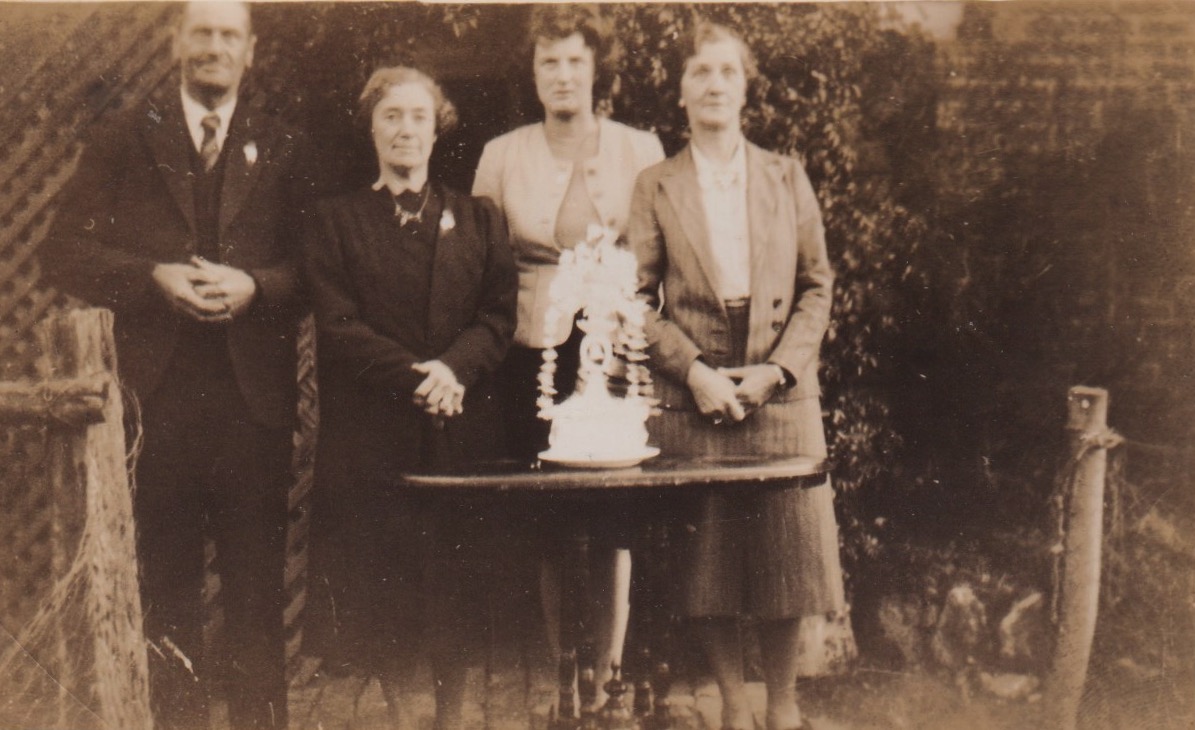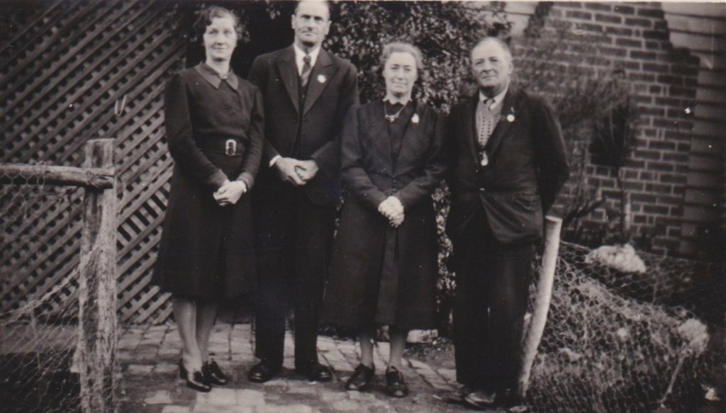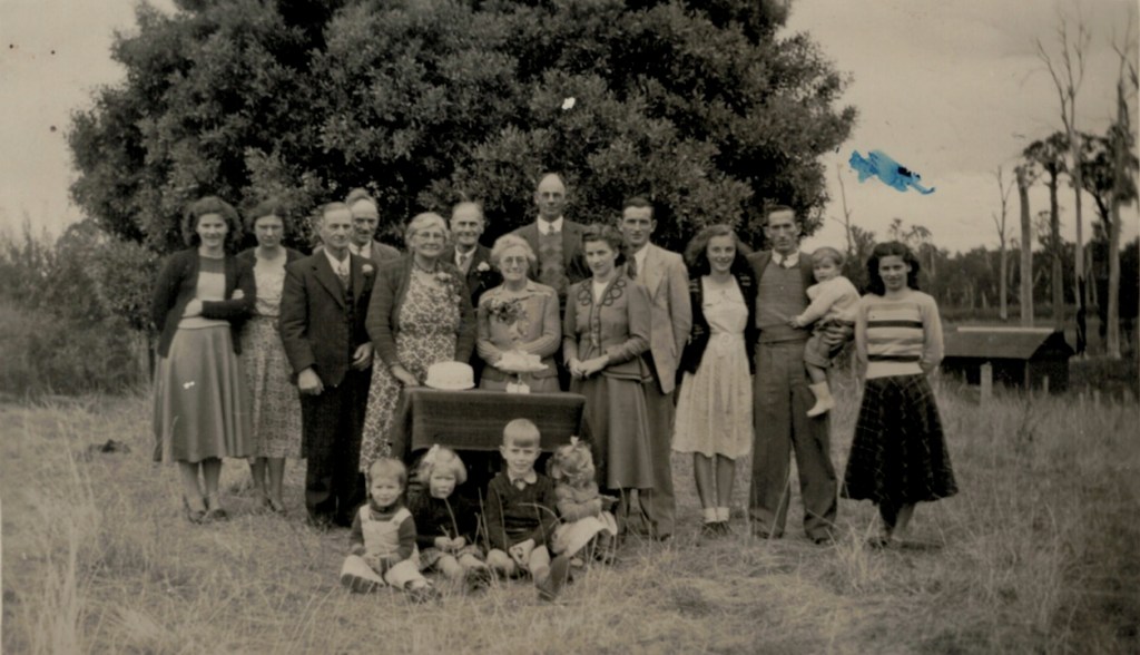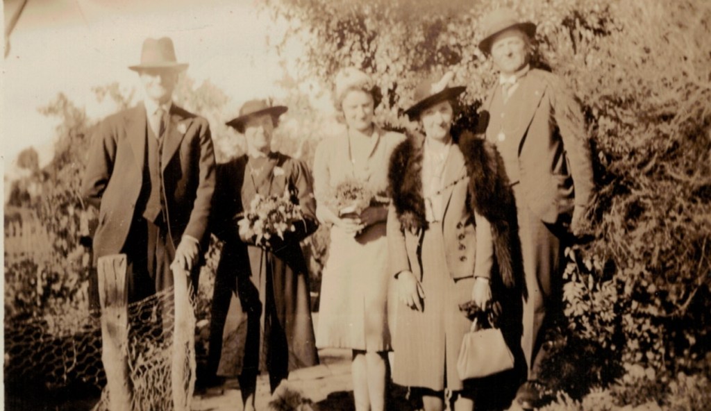 Ossie and Selma Schache (Adler): 35th wedding anniversary, Batlow, NSW, 25 April, 1951: L-R, Otto, Bertha (Schache), Selma and Ossie Schache.35th wedding anniversary with group: standing L-R: Beryl West (Schache), Elvie Tilley (Schache), Otto Schache, Sid Tilley, Bertha Schache (Schache), Ossie Schache, Selma Schache (Adler), Les Schache, Dorothy Hawkins (Schache), Allen Hawkins, Nonna Tilley (later Grimmett), Reg Hawkins (with Cliff), Mavis Hawkins (Schache); children at front: Helen Hawkins (later Wilson), Jennifer West (later Oakman), James Tilley, Margaret West (later Issleman); Batlow NSW [David Schache].j