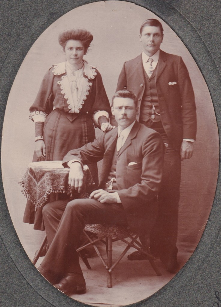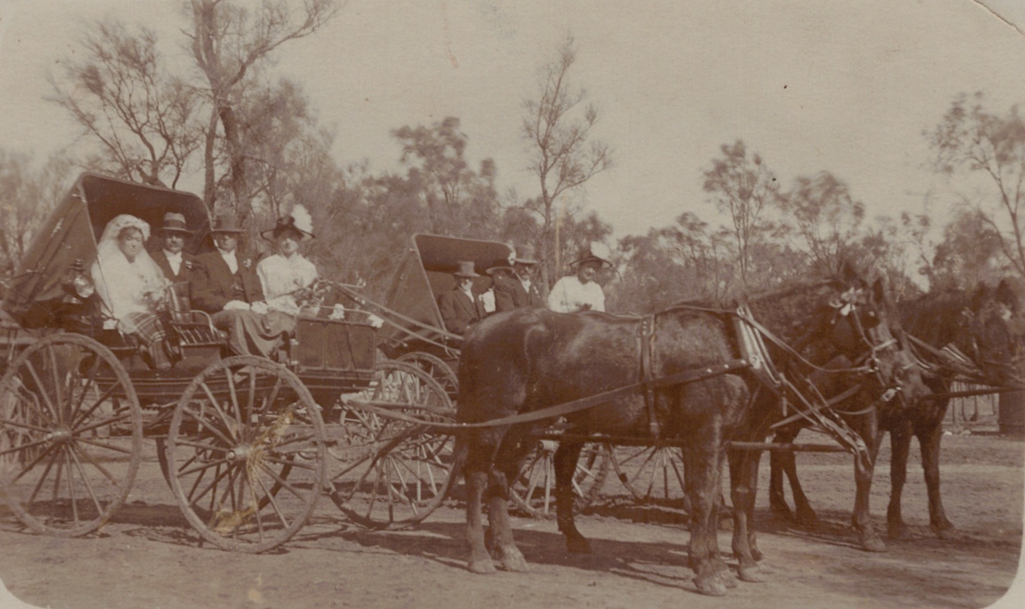 Schache siblings, taken on Ossie’s wedding day, Murtoa, Vic., 1916 (Drury’s): L-R, Fred, Bertha (Schache) and Ossie [Irma Russell (Schache)].Ossie and Selma Schache (Adler): bridal party arriving at “Sheoak Bank”, Coromby via Murtoa, Vic., 1916 for the reception (F. Schäche, photographer, Jung North via Murtoa, Vic.) [Winnie Schubert (Adler)].