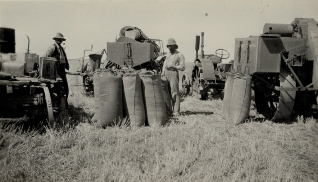 The wheat harvest on Ossie Schache’s share-farm, Murtoa, Vic., 1929-1930; Vic Schubert beside the harvester [Selmas Schache (Adler)].The wheat harvest on Ossie Schache’s share-farm, Murtoa, Vic., 1929-1930, taking off the last bags; Ossie left and Vic Schubert [Frances Schubert (Beard nee Wilson)].