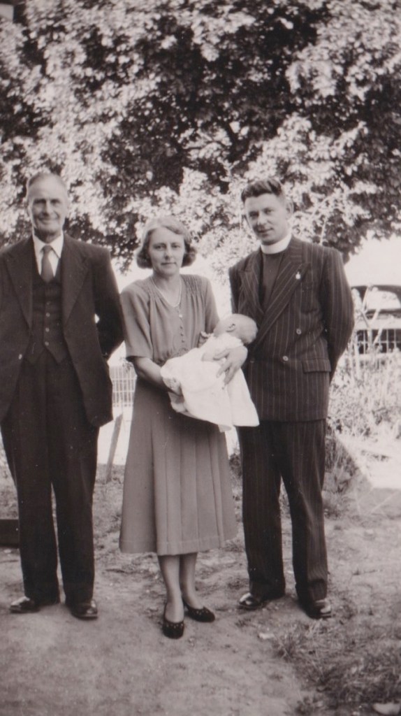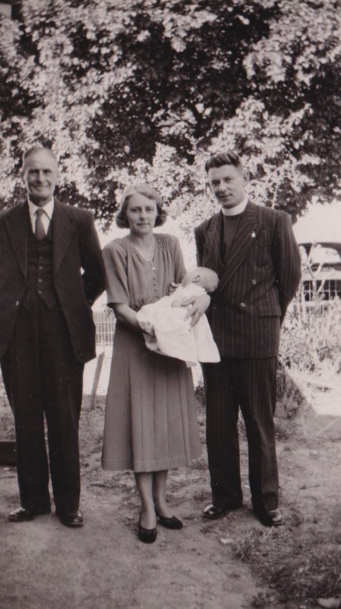 Baptism of Allan Russell, 1953, with Ossie Schache, Tess Schache (later Hausler) and pastor [Tess Hausler (Schache)].