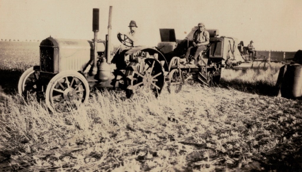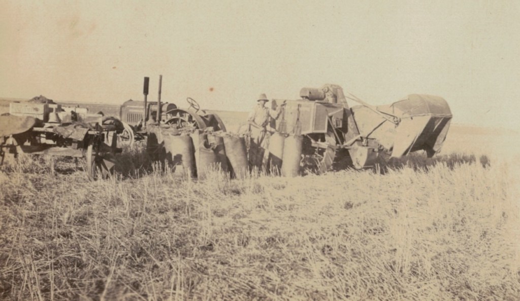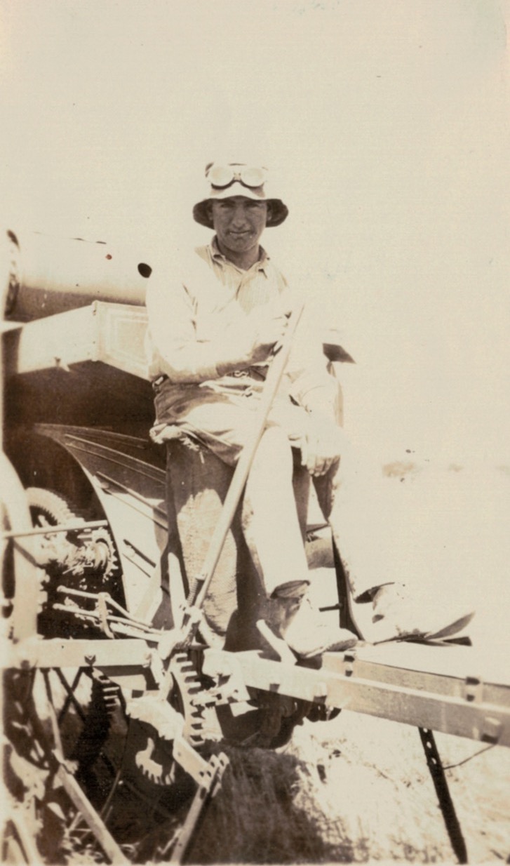 The wheat harvest on Ossie Schache’s share-farm, Murtoa, Vic., 1929-1930; Vic Schubert operating the harvester [Selma Schache (Adler)].