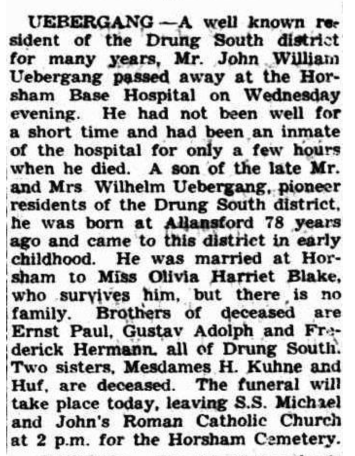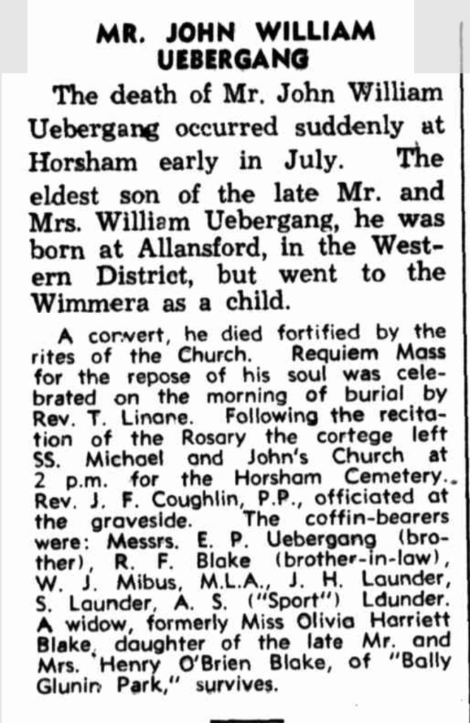1.5.3 UEBERGANG John William (Blake) “Horsham Times” (Vic.), Friday 5 July 1946, page 2 (extract from article “Obituary”). “Advocate” (Melbourne, Vic.), Wednesday 14 August 1946, page 21[Trove].