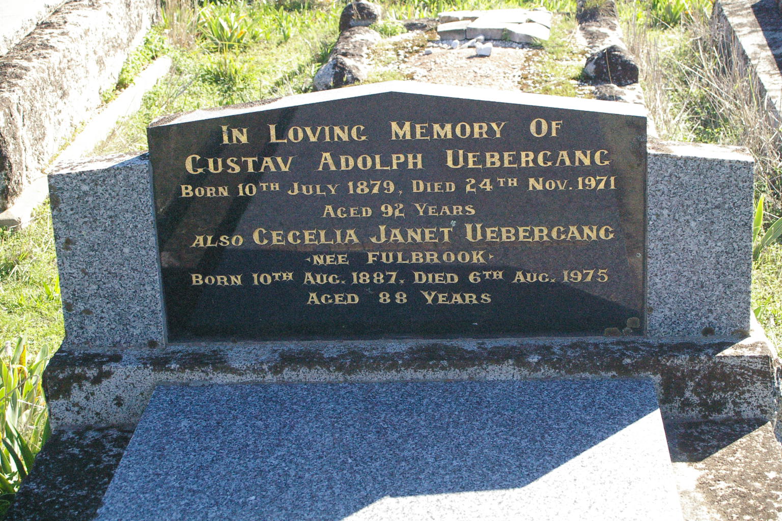1.5.7 UEBERGANG Gustav Adolph (Fulbrook) 1.5.7.1 UEBERGANG Adolph William (Arnott)1.5.7.2 UEBERGANG Cecilia Caroline (GAINGER)1.5.7.3 UEBERGANG Stanley Samuel (Kroker)1.5.7.4 UEBERGANG Ernestine Mary (WILLIAMSON)1.5.7.5 UEBERGANG Grace Irene (ROSS)1.5.7.6 UEBERGANG Frederick Arthur (Trigg) Headstone for Gustav and Cecilia Uebergang (Fulbrook), Green Lake cemetery via Horsham, Vic. [Carol’s Headstone Photographs].