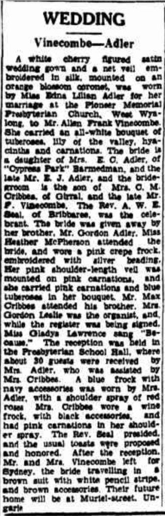 1.6.2.2 ADLER Edna Lillian (VINECOMBE) Published References (1.6.2.2 ADLER) “Daily Advertiser” (Wagga Wagga, NSW), Tuesday 2 July 1946, page 4 [Trove].