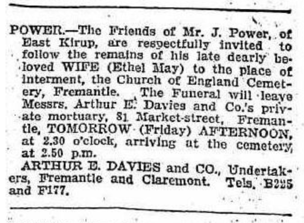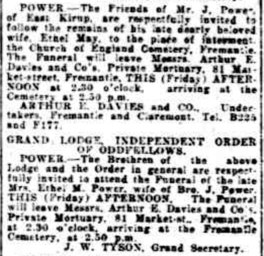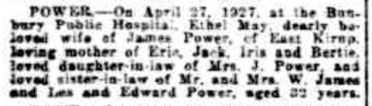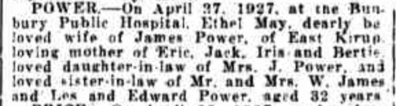 1.6.3 BAYLDON Ethel May Victoria (POWER) 1.6.3.1 POWER Eric James (Oxwell)1.6.3.2 POWER John Leslie (Ramage)1.6.3.3 POWER Iris May Victoria (POULTON)1.6.3.4 POWER Herbert Edward (Sforcina) “Daily News” Perth, WA), Thursday 28 April 1927, page 1 (“Funeral Notices”). “West Australian” (Perth, WA), Friday 29 April 1927, page 1 (“Deaths”) [Trove]. “West Australian” (Perth, WA), Friday 29 April 1927, page 1 (“Funeral Notices”) [Trove]. “Daily News” (Perth,WA), Wednesday 4 May 1927, page 2 [Trove]. “Western Mail” (Perth, WA), Thursday 5 May 1927, page 2 (“Deaths”) [Trove].