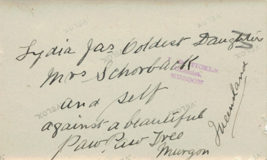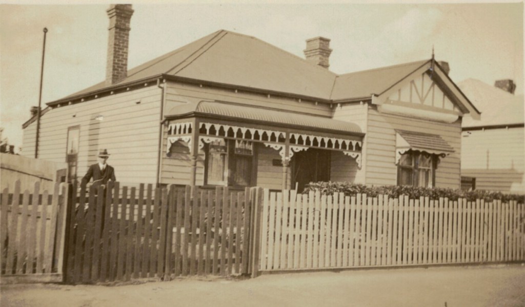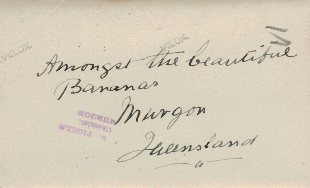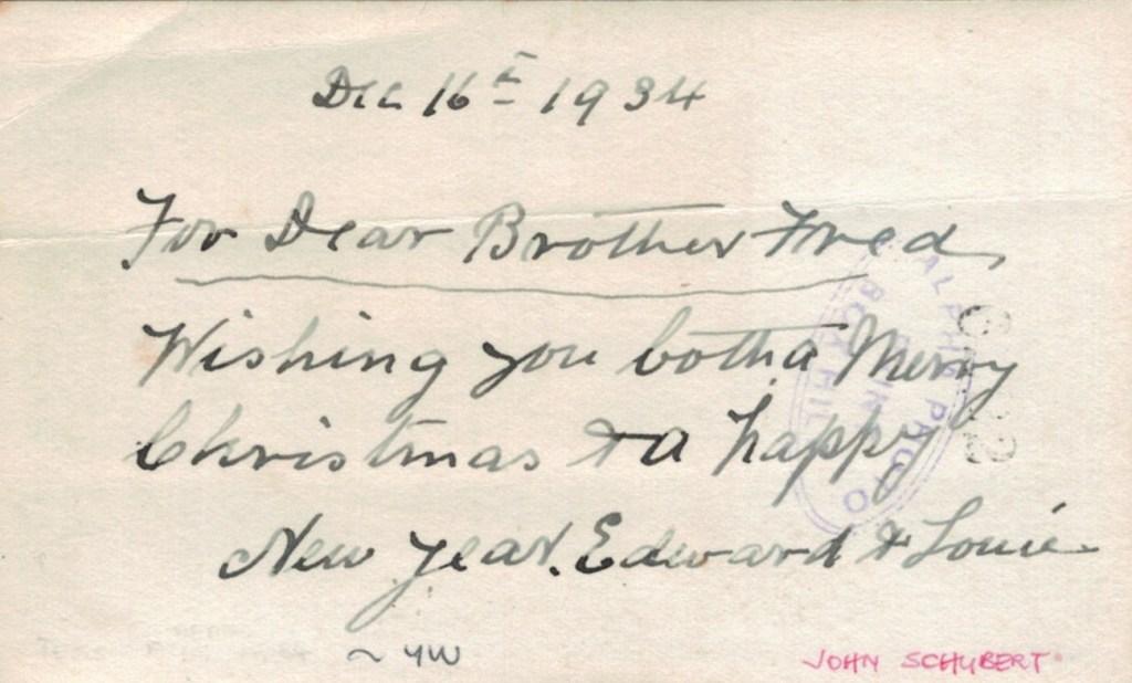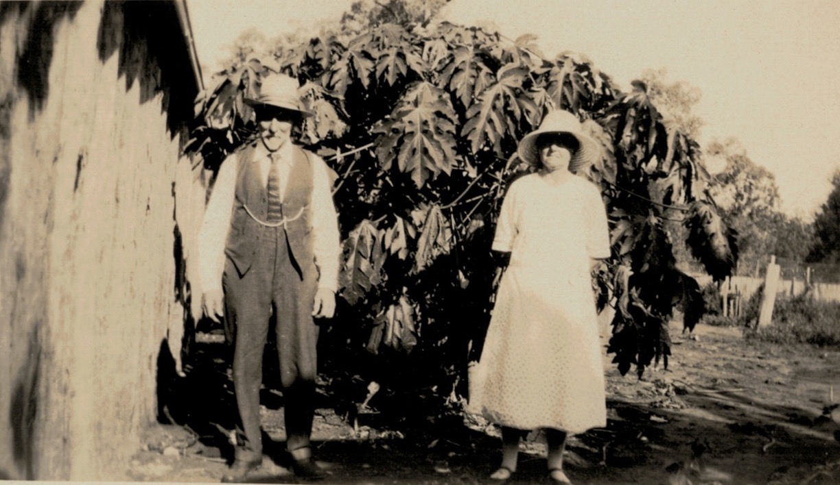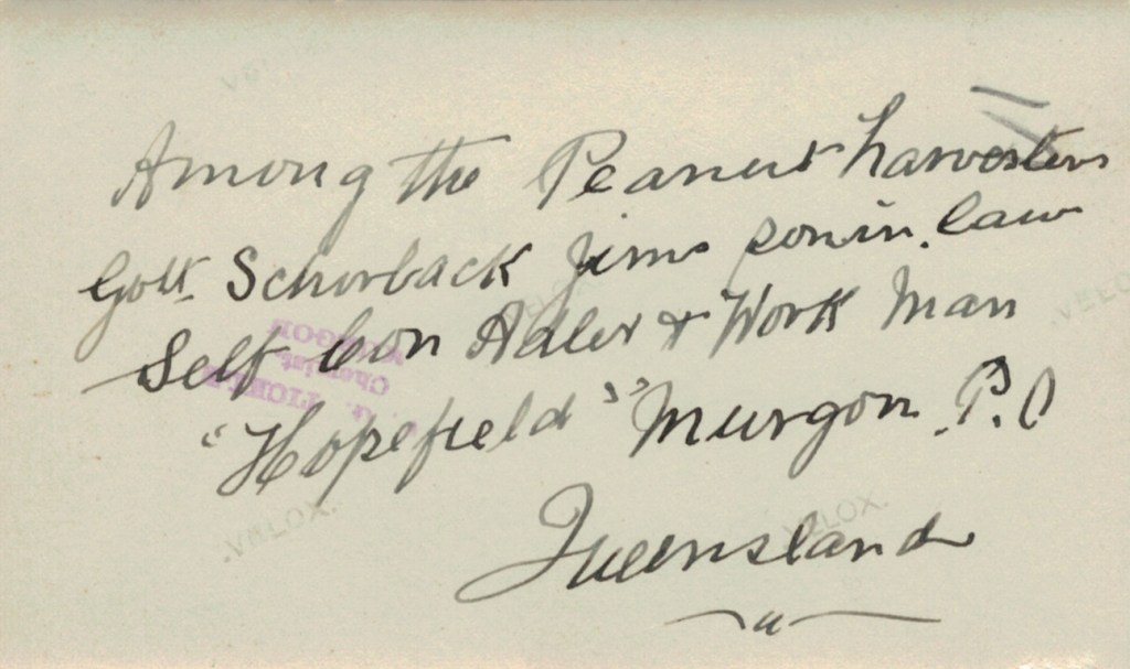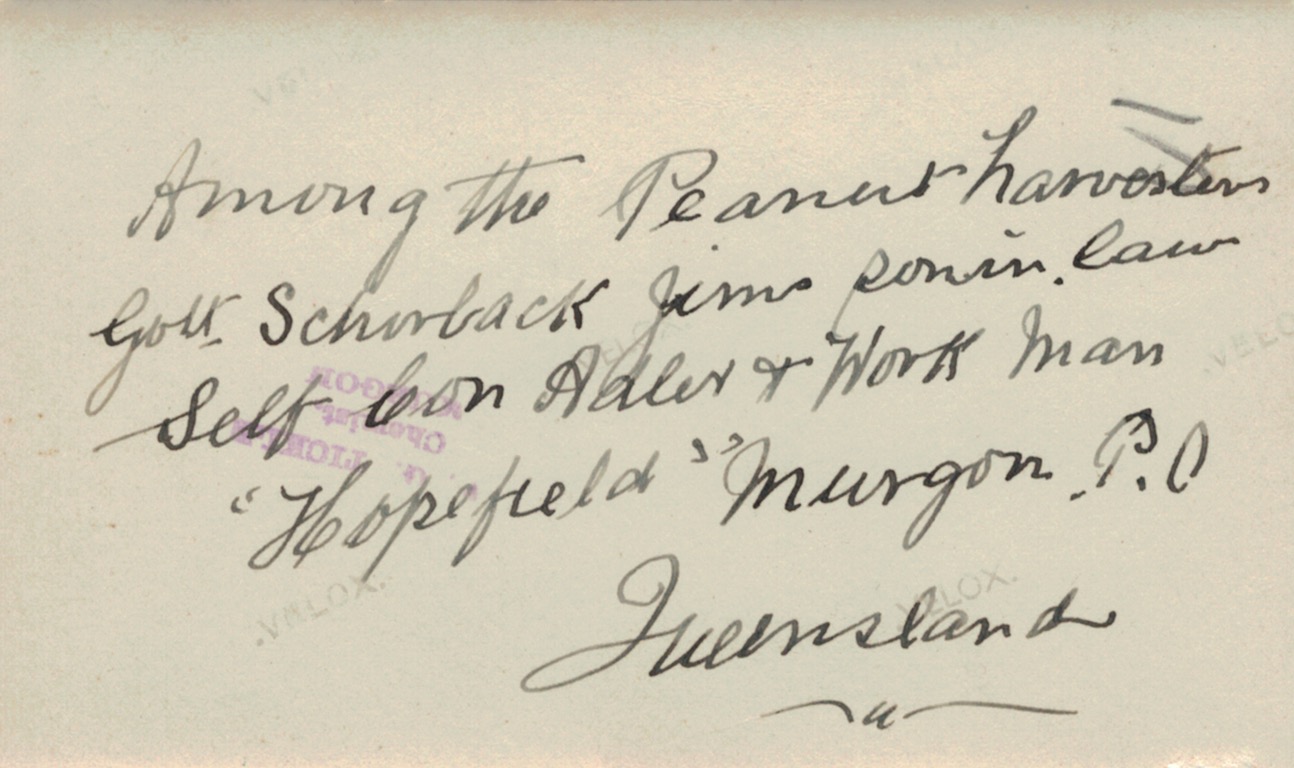 Ned Adler with peanut harvesters on Jim Adler’s farm, Merlwood via Murgon, Qld, 1933: LโR, Gottlieb Schorback, Ned Adler, Con Adler and workman.Reverse side of photograph above.Ned Adler with Lydia Schorback (Adler, later Schulz) on Jim Adler’s farm, Merlwood via Murgon, Qld, 1933.Reverse side of photograph above.Ned Adler on Jim Adler’s farm, Merlwood via Murgon, Qld, 1933Reverse side of photograph above.Ned and Louie Adler (Hering nee Smith), 1934 [Tess Hausler (Schache)].Reverse side of photograph above.Home of Ned and Louie Adler (Hering nee Smith), โCliftonโ, 21 Holywood Grove, Carnegie Vic., 1930s [David Schache].