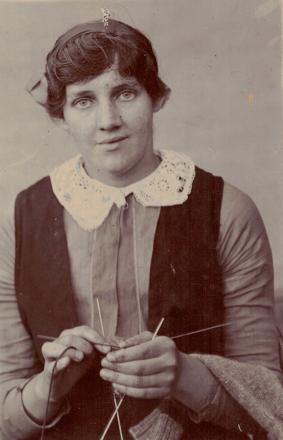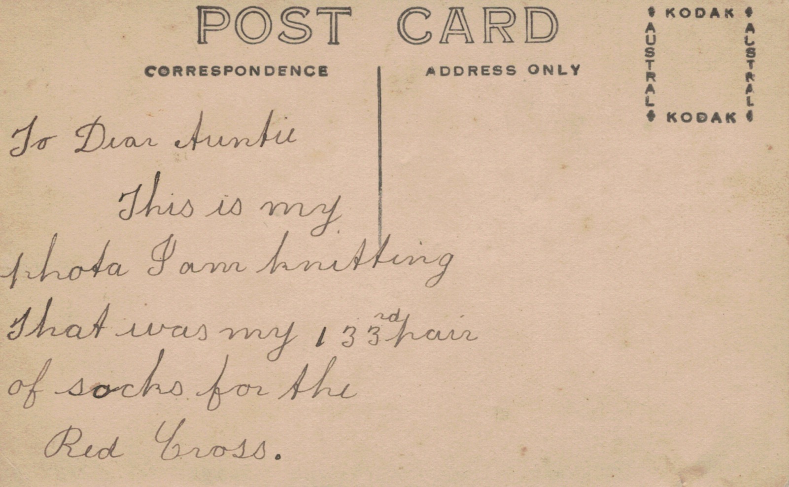 1.7.1 DONEHUE Elsie Adelene Published References (1.7.1 DONEHUE) Elsie Donehue, knitting socks for the Red Cross, 1917, a photograph published in the “Weekly Times”. Reverse of photograph above, sent to Mary Trew (Bown).