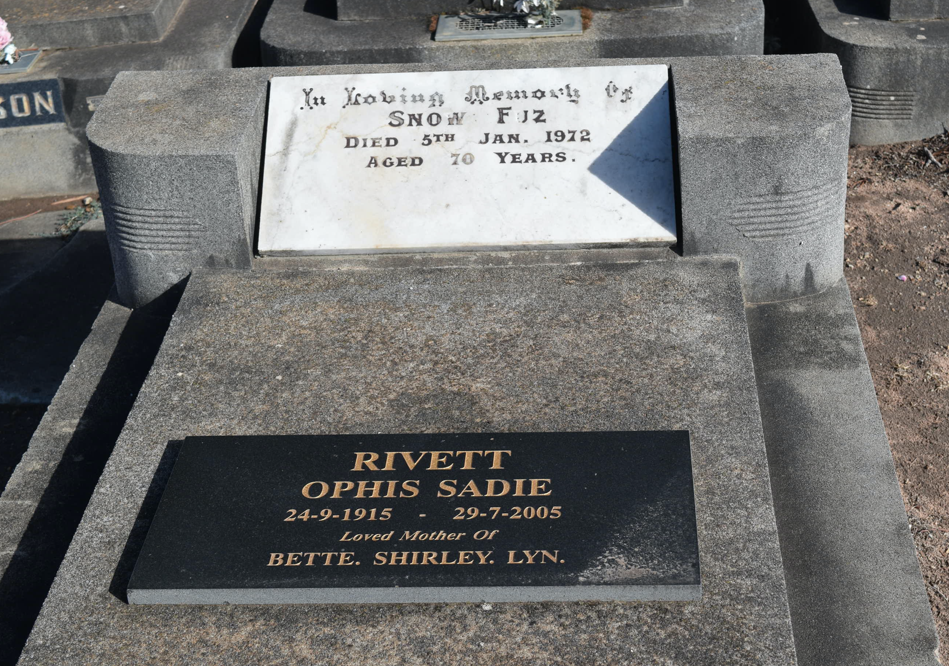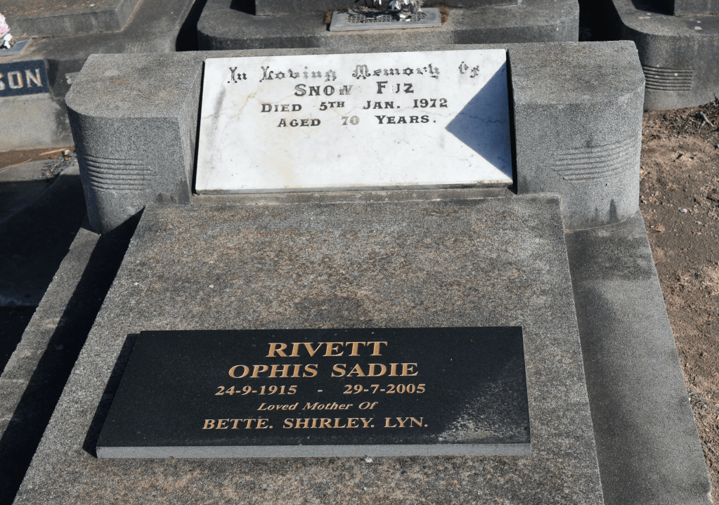1.7.6 DONEHUE Ophis Sadie (RIVETT) Grave of Sadie Rivett (Donehue), Warracknabeal Cemetery, Vic. [Carol’s Headstone Photographs].