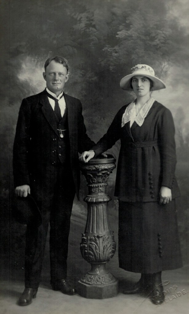 Dan and Olga Wilhelm (Schache), probably on their honeymoon in Adelaide (Crown Studios, Adelaide) [Irma Russell (Schache)].