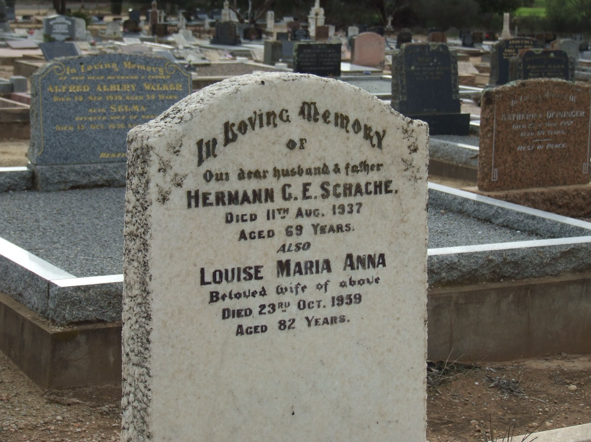 1.7.8 SCHACHE Hermann Gottlob Emanuel (Burgermeister) 1.7.8.1 SCHACHE Albert Berthold (Pech)1.7.8.2 SCHACHE Oswald Reinhold (Fiegert)1.7.8.3 SCHACHE Hugo Ewald (Baum)1.7.8.4 SCHACHE Edwin Hermann1.7.8.5 SCHACHE Antonia Hedwig (PFEIFFER/KUCHEL)1.7.8.6 SCHACHE Viola Regna (FRAHN)1.7.8.7 SCHACHE Adolph Press References (1.7.8 SCHACHE) Hermann Schache (Niesche, Photographic Atelier, 97 Rundle Street, Adelaide SA) [Tess Hausler (Schache)]. Headstone for Hermann and Anna Schache (Burgemeister), Mannum Cemetery, SA (Find a Grave].