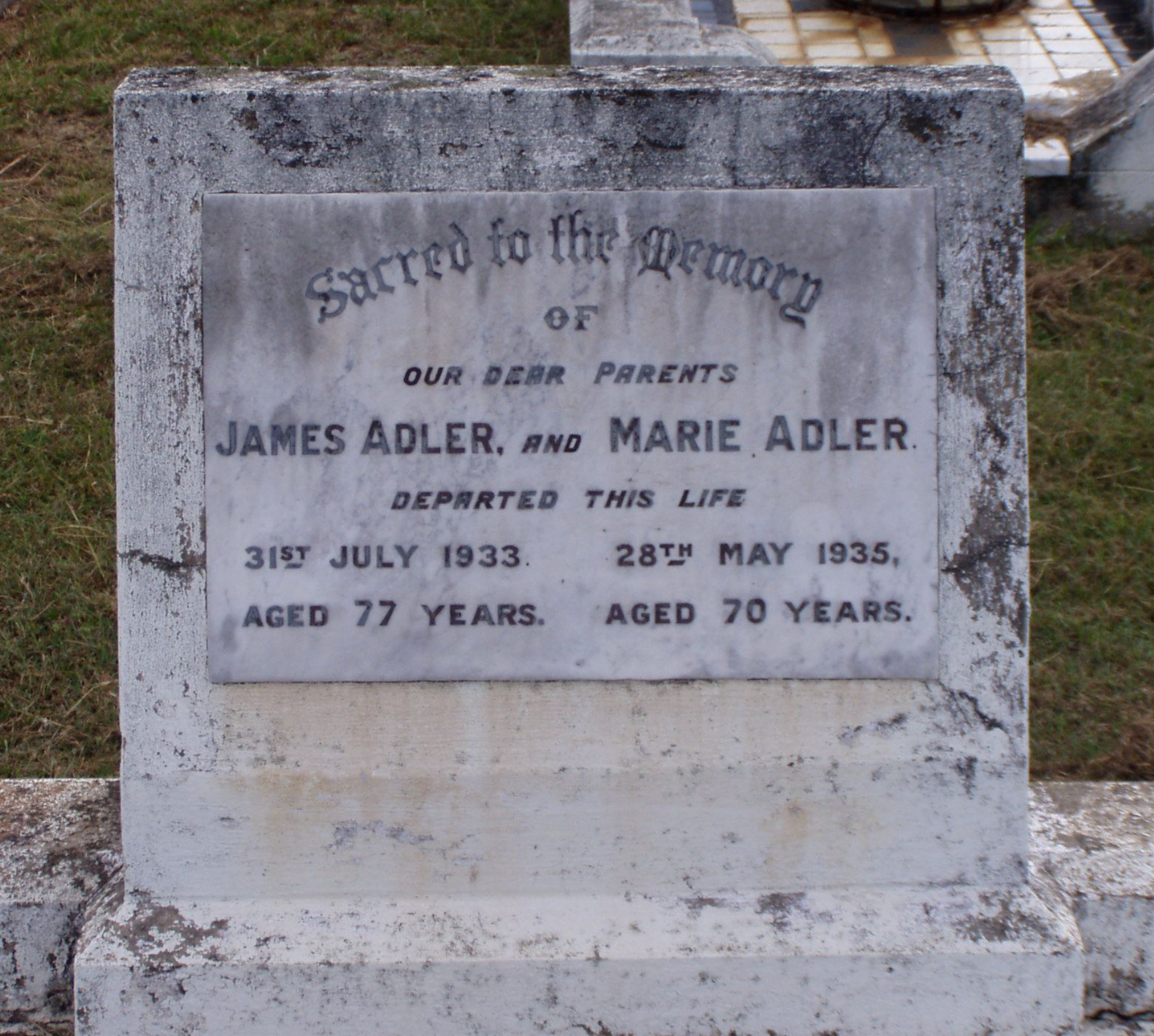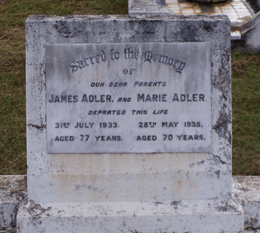 Headstone for Jim and Mary Adler (Schache), Murgon Cemetery, Qld. [Find a Grave].