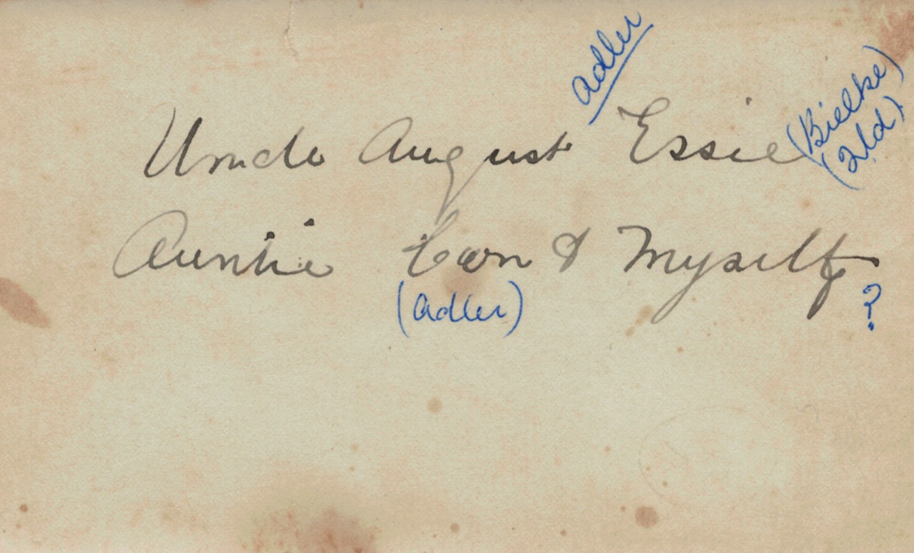 First school in Murtoa, c. 1874 (with teacher and Mrs Walter): Mary Schache (later Adler), 1st from left in back row; her sister Lizzie (later Burrus), 7th from left in back row.; and cousins Lena Schache (later Schache), 6th from left in back row and Susan (later Reinecke), 4th from left in front row.Jim Adler.Jim and Mary Adler (Schache) and family, c. 1900: L-R, Gertie (laterSchmidt), Jim, Con, Lydia (later Schorback/Schulz) with Essie (later Bielke) reclining on Mary..Jim and Mary Adler (Schache) and family, c. 1907: standing L-R, Lydia (latder Schorback/Schulz), Gertie (later Schmidt); seated L-R, Jim, Allie (later Miller). Mary, Essie (later Bielke) and Con,Mary Adler (Schache).Home of Jim and Mary Adler (Schache), Merlwood via Murgon, Qld.August Adler (standing L), visiting Jim Adler and family, Merlwood via Murgon, Qld.August Adler visiting Jim Adler and family, Merlwood via Murgon Qld: L-R, August Adler, Con Adler, Mary Adler (Schache), Essie Bielke (Adler) and Jim Adler.August Adler visiting Jim Adler and family, Mertwood via Murgon Qld: L-R, August Adler, Essie Bielke (Adler), Mary Adler (Schache), Con Adler and Jim Adler.Reverse side of photograph above (written by Jim Adler). Ned Adler with peanut harvesters at Jim Adler’s farm, Merlwood via Murgon, Qld, 1933: LโR, Gottlieb Schorback, Ned Adler, Con Adler and workman.Reverse side of photograph above.Ned Adler with Lydia Schorback (Adler, later Schulz) on Jim Adler’s farm, Merlwood via Murgon, Qld, 1933.Reverse side of photograph above.Ned Adler on Jim Adler’s farm, Merlwood via Murgon, Qld, 1933.Reverse side of photograph above.Mary Adler (Schache) seated; standing L-R, Alma Schmidt, Gertrude Schmidt (Adler) and Irene O’Dea (Schmidt).