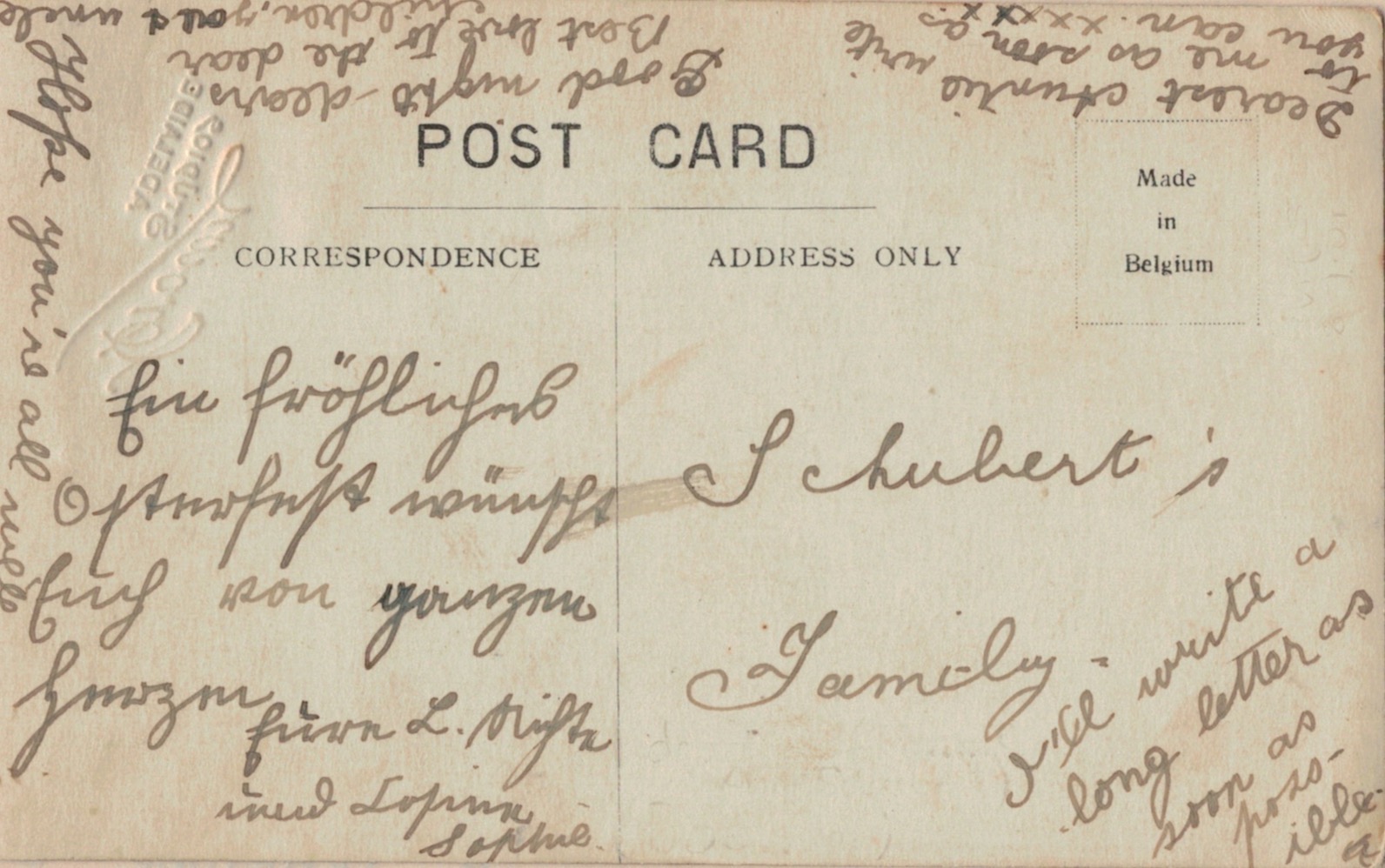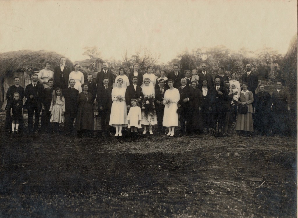 Alex and Sophie Liebelt (Boehm) bridal photograph, 1922; Gus and Minnie Boehm (Schubert) immediately left of the bridal party [David Schubert].