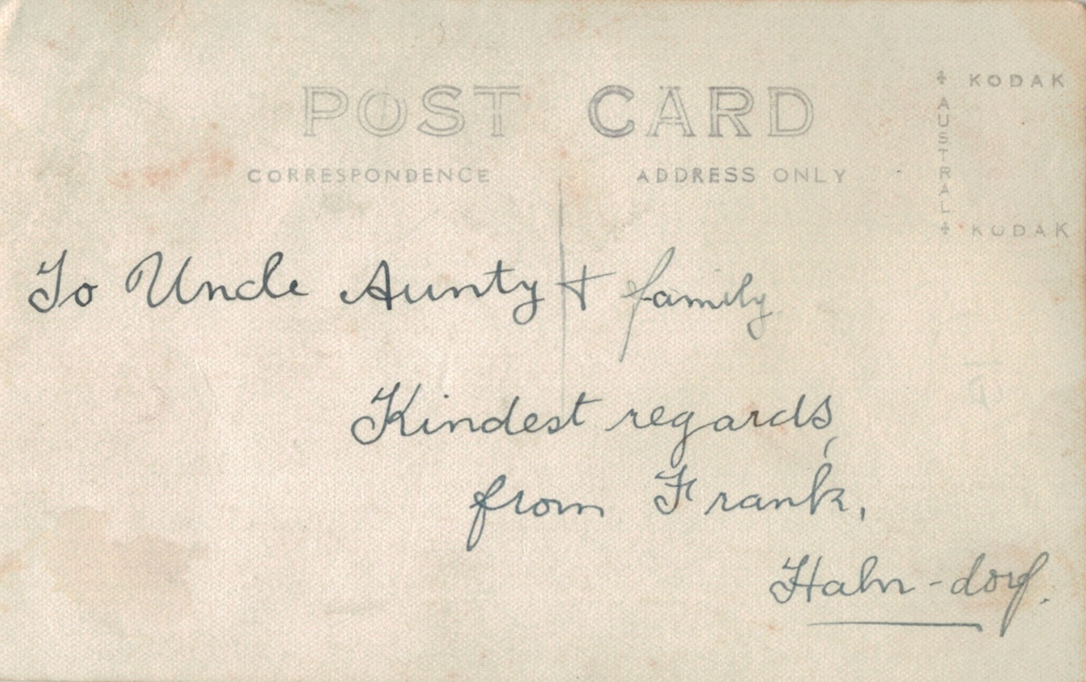 1.8.10.1 SCHUBERT Franz Leonard (Heinrich) Frank Schubert, Hahndorf, SA. Reverse of photograph above, sent to Anton and Emilie Schubert (Renner).