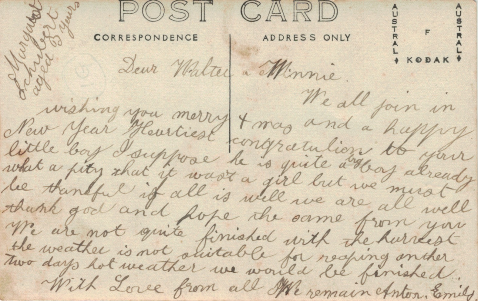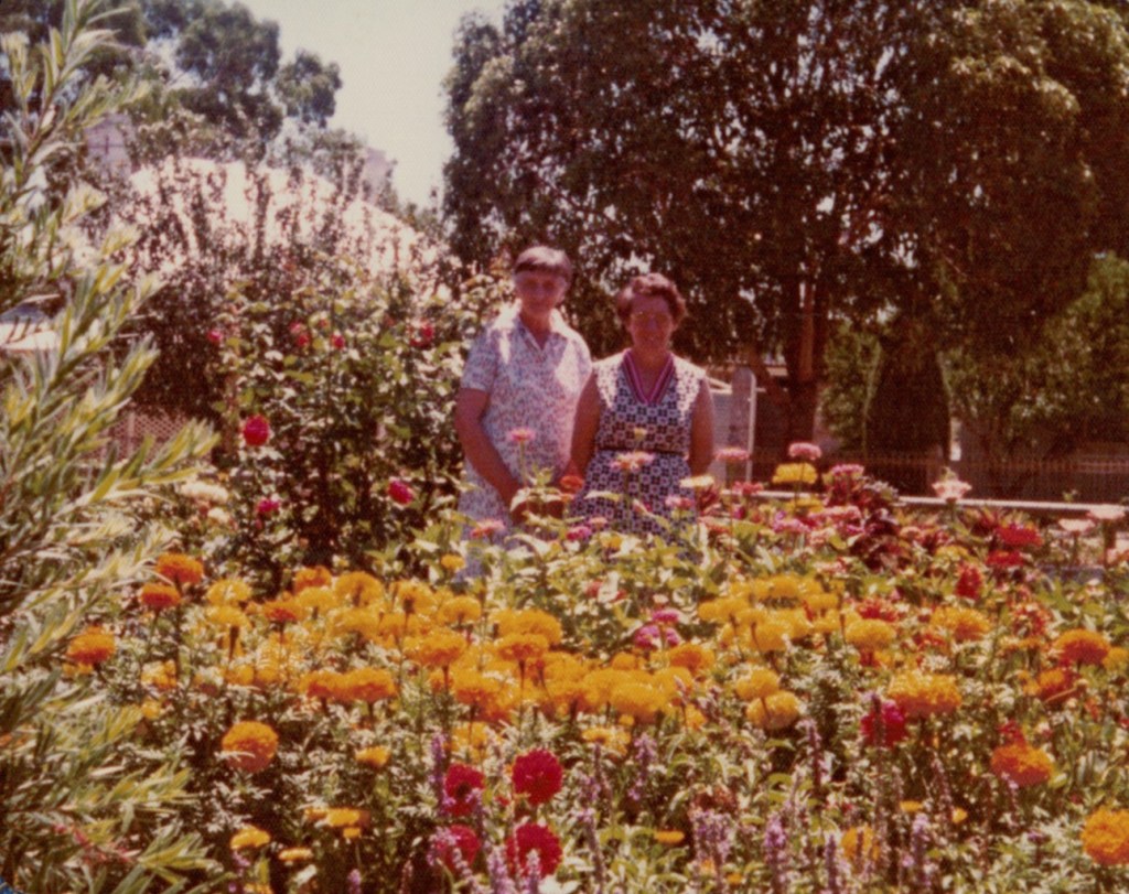1.8.4.5 SCHUBERT Margaret Anita Margaret Schubert, 3 years (C. C. Yates, Angaston) [Winnie Schubert (Adler)]. Teverse of photograph above. Margaret Schubert [Dolly Storch (Schubert)]. Margaret Schubert (Marchants Studio, Tanunda and Gawler) [Winnie Schubert (Adler)]. Margaret and Elma Schubert (Gerhard Graue photograph). Elma and Margaret Schubert in their garden, Marananga, SA, 1963 [Elma and Margaret Schubert]. Elma and Margaret Schubert in their summer garden, Tanunda, SA, 1976-77 [Elma and Margaret Schubert].
